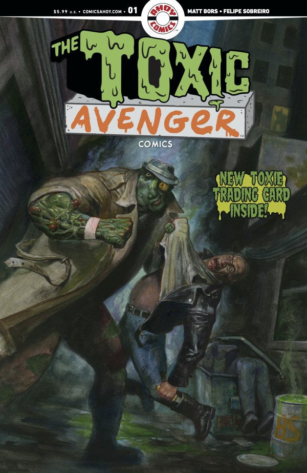 Crime issue! A dead body lies on a rainswept street in the neon light of downtown Tromaville. A note pinned to the corpse points the accusing finger at the Toxic Avenger, leading an armored SWAT team to surround his junkyard! Featuring two incentive covers: one by writer Matt Bors, and a photo cover tying in to this summer’s all-new TOXIC AVENGER blockbuster film.