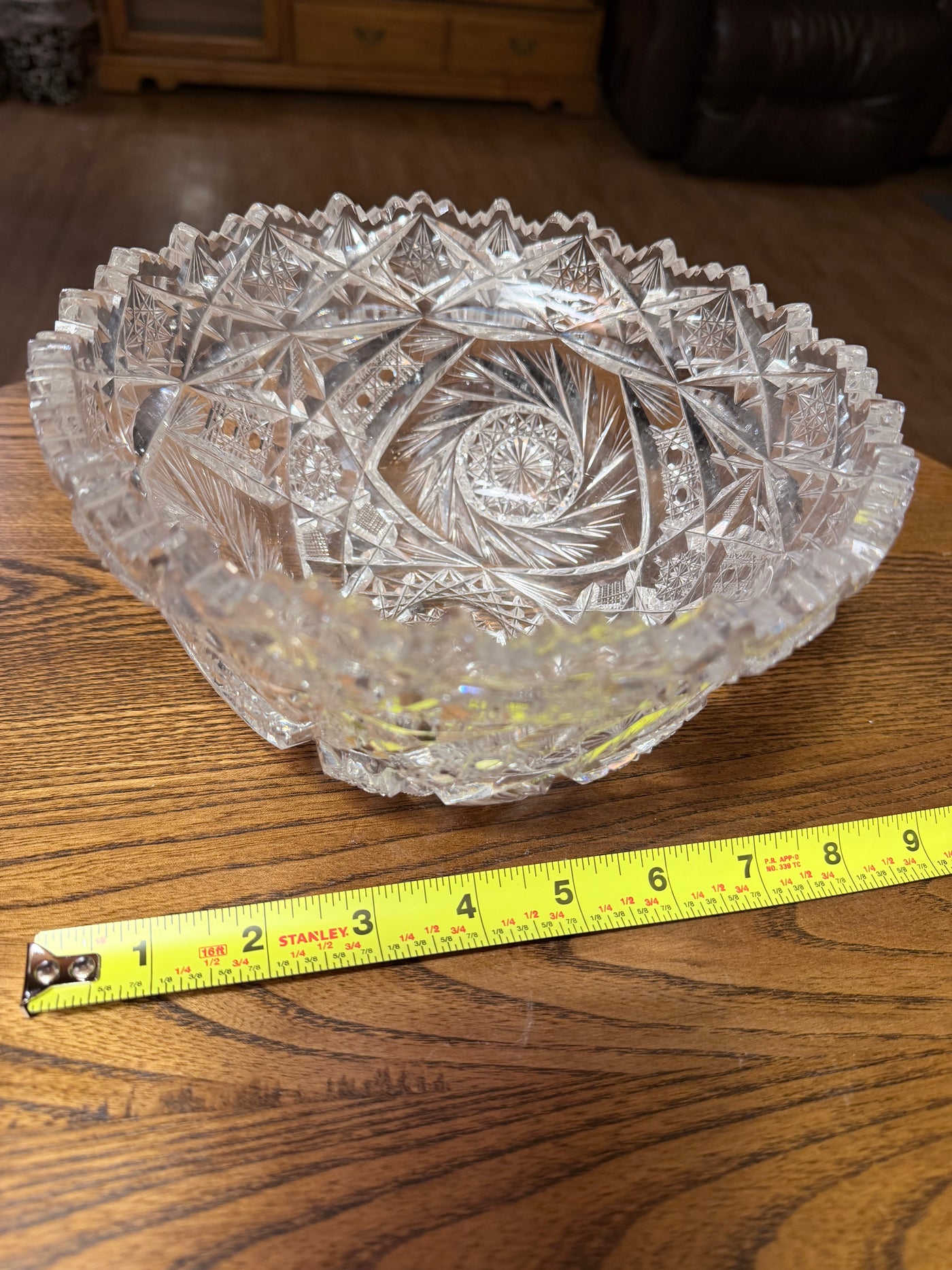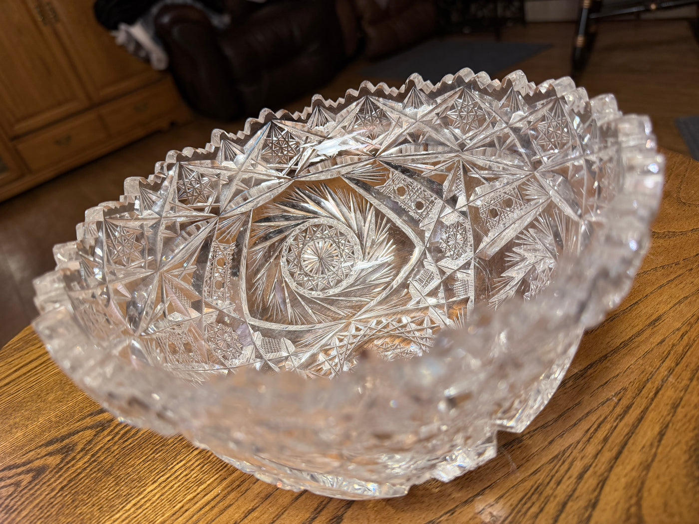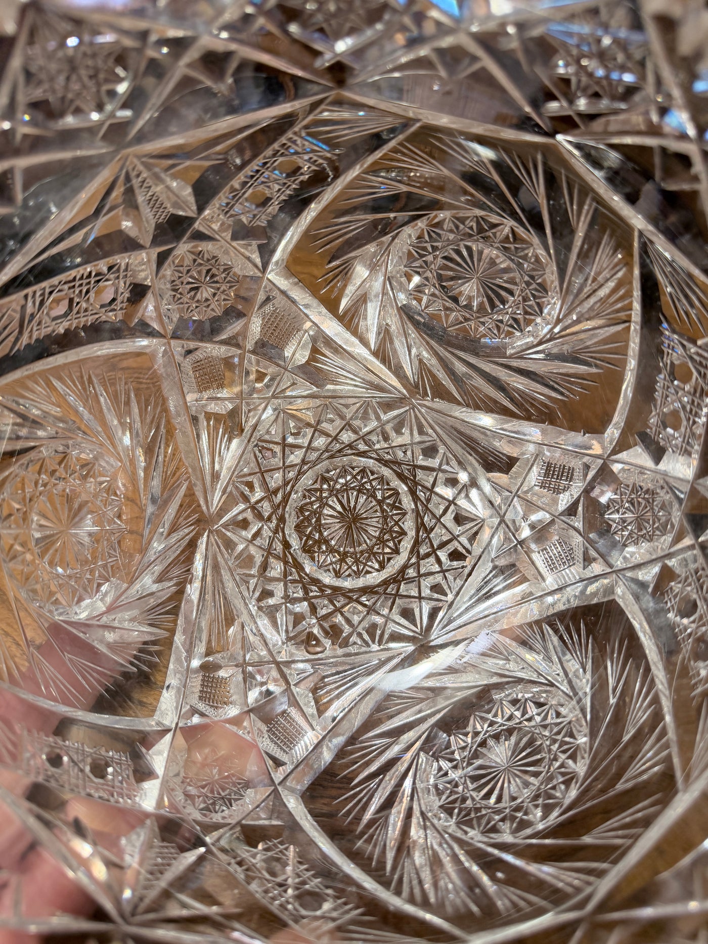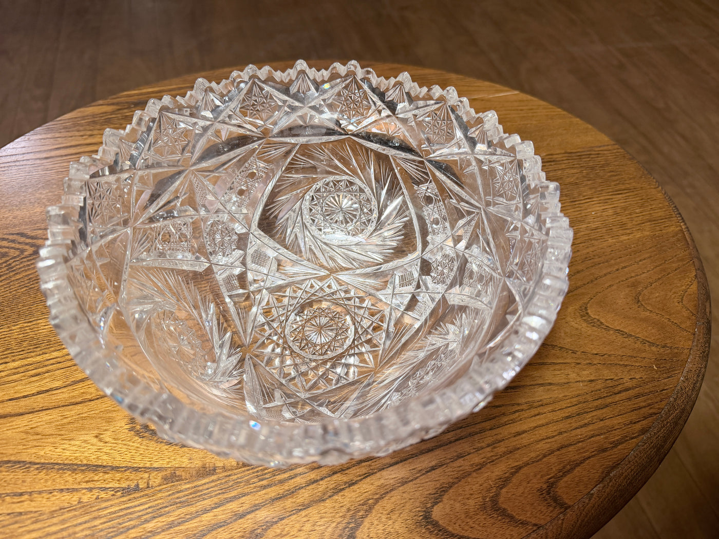 Beautiful cut glass bowl from the American Brilliant Period (1876–1917). Exceptionally intricate cuts, much more complex than most examples of this style of bowl. No cracks or noticeable scratches.