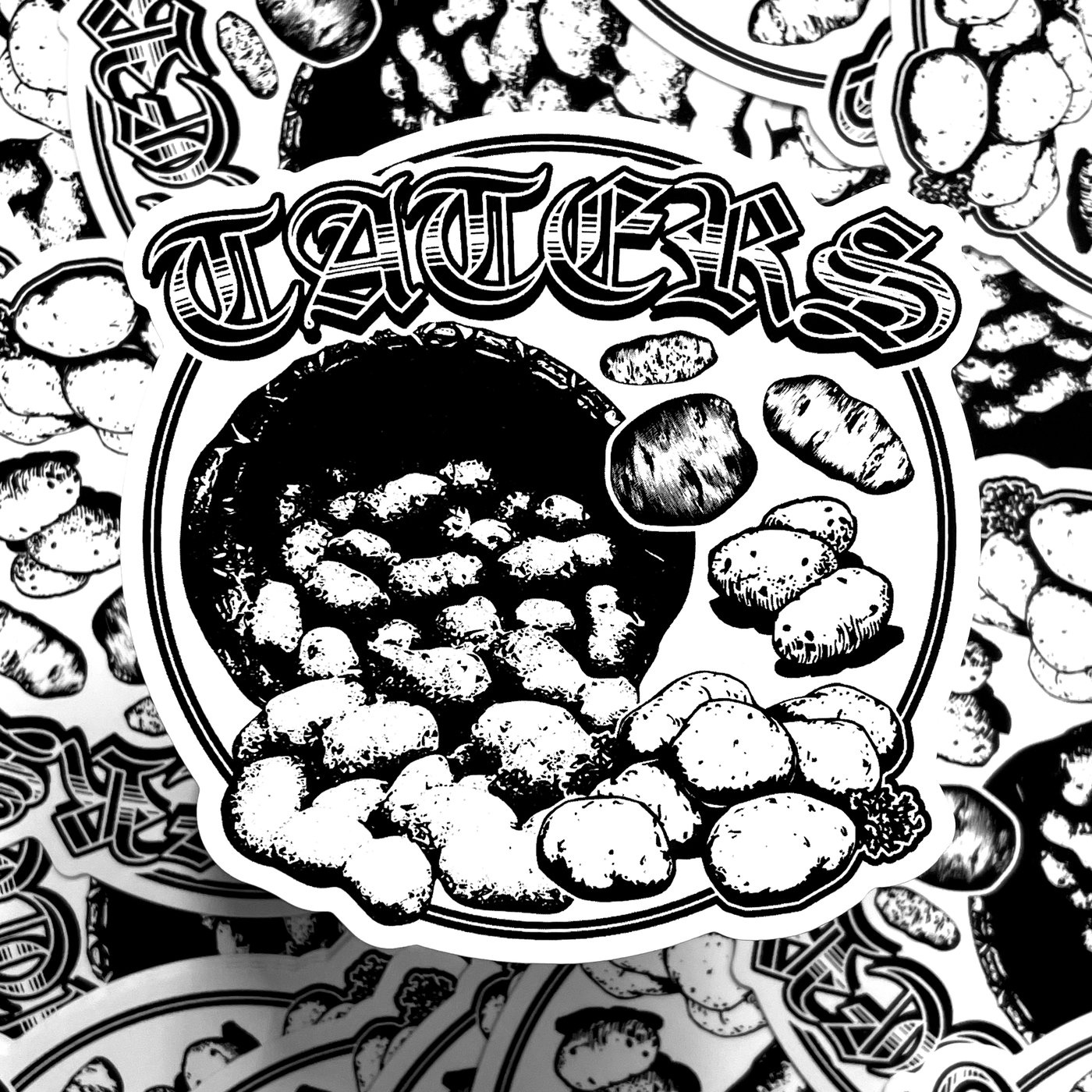 If you don't enjoy taters, you are a miserable loser and we must fight. Here is a 3.5" x 3.5" black and white vinyl sticker featuring the fruit of the soil: taters.