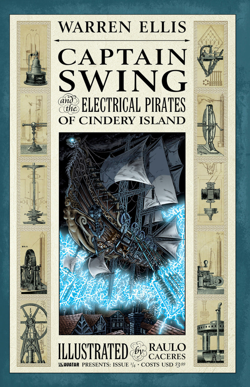 From the sparking-mad mind of Warren Ellis, the creator of AETHERIC MECHANICS and DOKTOR SLEEPLESS, comes an electrical romance of a pirate utopia thwarted: CAPTAIN SWING & THE ELECTRICAL PIRATES OF CINDERY ISLAND. This crackling new mini-series is illustrated in Raulo Caceres' stunning woodcut style, and presented in full color. London, 1830: newly-minted copper Charlie Gravel keeps seeing things he's not supposed to. A crooked Bow Street Runner with a flintlock revolver, flying things that are not supposed to fly, and the violent Scientific Phantasmagoria that is christened Spring-Heeled Jack, but is known by other names. It is the time of Captain Swing and his Electrical Pirates, and history will never be the same. CAPTAIN SWING #1 is available with a Regular or Wraparound cover by series artist Raulo Caceres, and a special retailer incentive Penny Dreadful cover designed to look like a classic novel of yore.