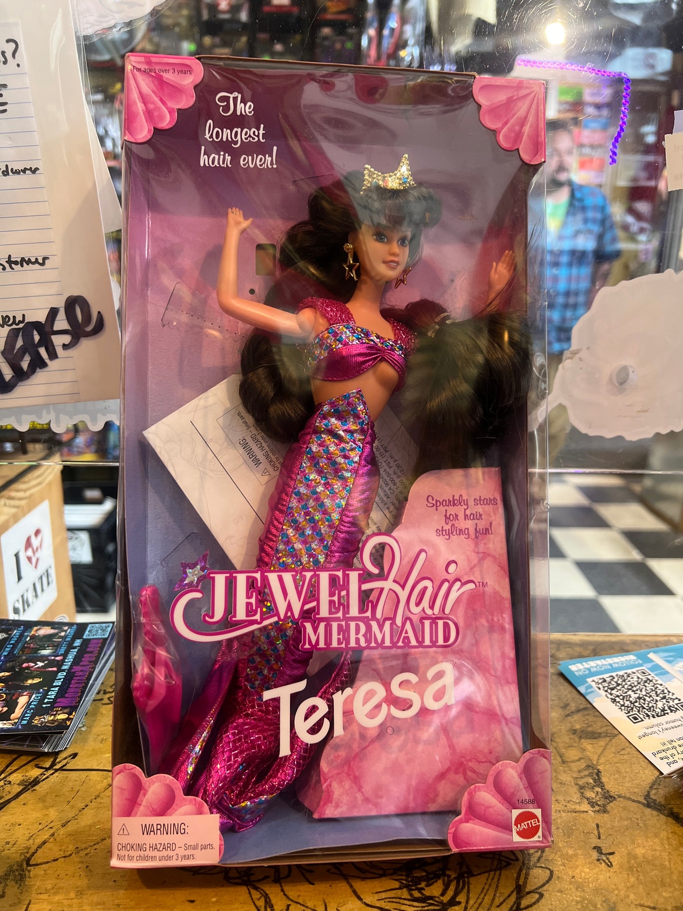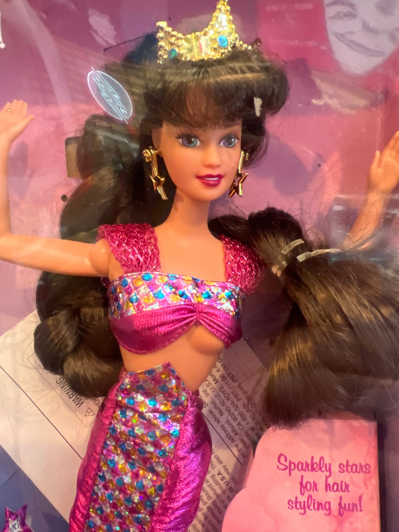 Box is open on the bottom accessories appear still sealed, the figure has been removed but the ties on the hair are still present although they have broken from age. Box has some tears but is still solid and presents nicely.