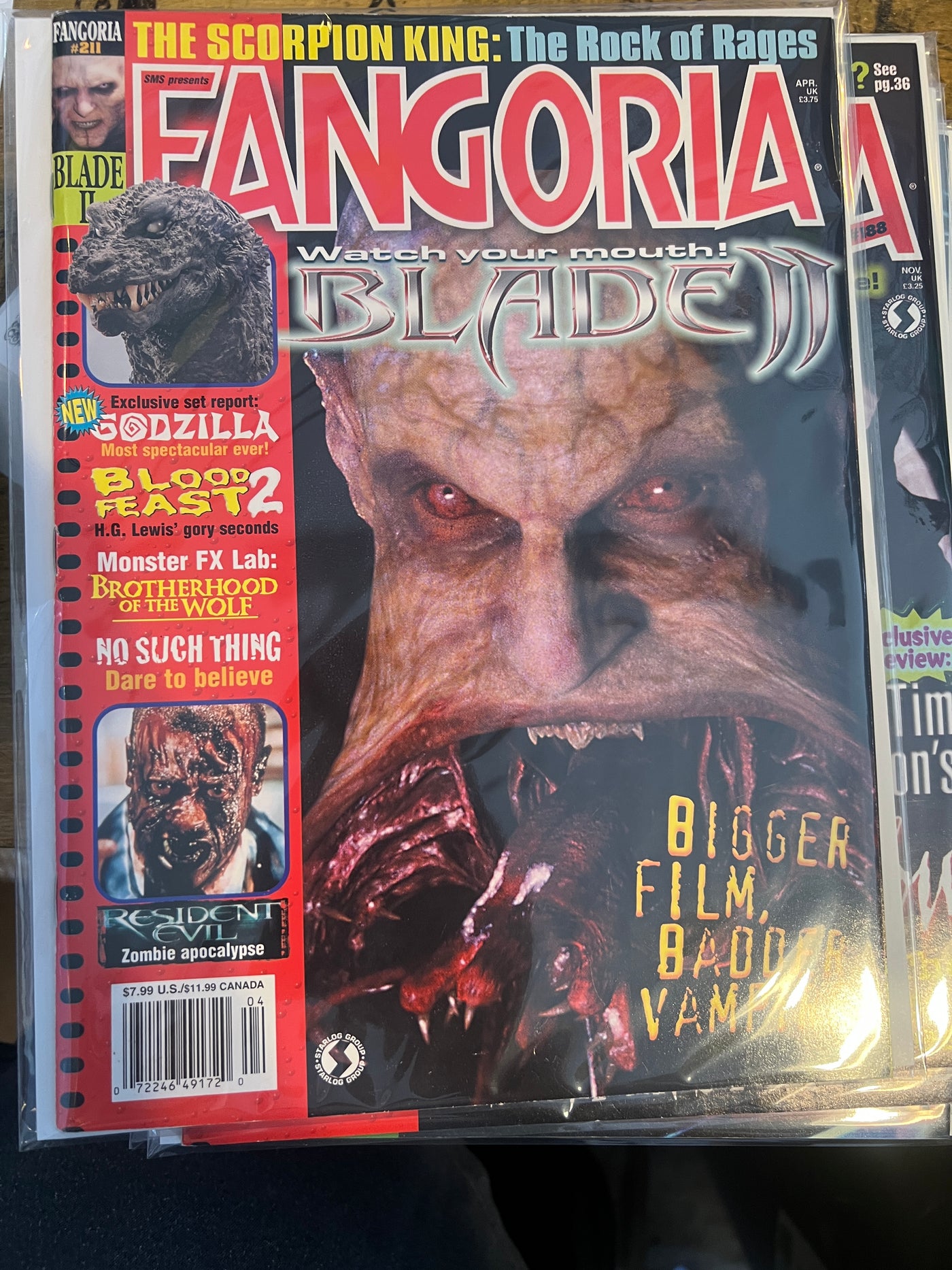 Blade 2; The Rock in The Scorpion King; Godzilla - exclusive set report; Blood Feast 2 - H.G. Lewis' gory seconds; Monster FX Lab - Brotherhood of the Wolf; Resident Evil.