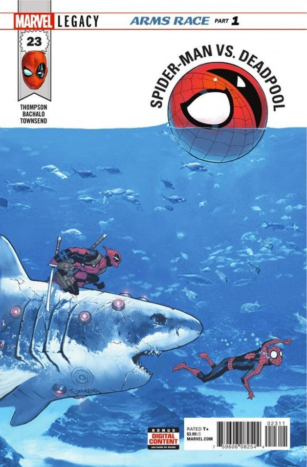 When Spider-Man learns that Deadpool is selling S.H.I.E.L.D. technology on the black market it's the last straw. Bromance? Over! It's time to hunt Deadpool! The two biggest characters in comics are facing off and it's going to take them all over the Marvel Universe, no holds barred. As you can see from this cover, Deadpool's even willing to use his laser-sharks. And it will all lead to the biggest Spider-Man/Deadpool story of all time!