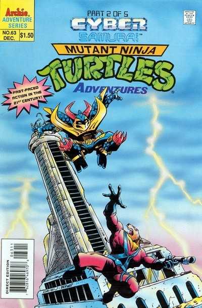 "Dreamland", Part 2, plus April O'Neil backup story "The Angel of Times Square", Part 2. The five part "Dreamland" story takes place in the future and features the future versions of the TMNT in their Cyber Samurai gear. Back at Turtleco, the brain "wakes up" and views scenes on the Time-Slip Generator of Berlin being bombed by the allies back in the 1940s.Meanwhile, a boat is attacked by three heavily armored bandits. The guards onboard are severely outgunned and one is killed, but the Cyber Samurai Turtles arrive and defeat the exo-suited murderers - who mysteriously give off no signs of life when scanned. Don unmasks one to reveal a rotting, zombie face. Verminator X is viewing the scene on a monitor in his spacecraft and vows vengeance against the Turtles for thwarting his plans yet again. The Turtles split up to see if they can find any clues. As Mike flies through the air, Verminator X leaps from a building and lands on his back. The futuristic feline attacks Mike with a fervor, removing his exoskeleton and beating him senseless. As the villain is about to finish the Turtle, a strange creature arrives and tells X to accompany him.Raphael is flying low patrol when a spaceship erupts out of the waters, nearly colliding with the ninja. Raph calls Mike and asks him if he can see the ship - but he gets no reply. Fearing the worst, our hero zooms off to find his brother. Back at Turtleco, Don suspects Verminator X or Thanotics are behind the robberies of NASA parts. The two head towards the room housing the Time-Slip Generator and are shocked to see that it's on again and still showing scenes of Nazi Germany. Suddenly, Raph arrives with the body of Mike and announces that the fallen Turtle is not breathing...