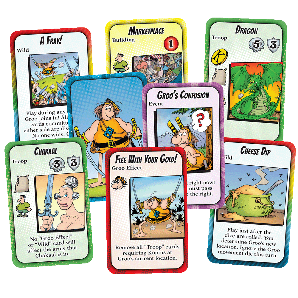 Try to build a town . . . without having it stomped to rubble by Groo the Barbarian! Fans of Mad Magazine love Sergio Aragonés, and they love his character Groo the Barbarian. Groo is a warrior and wanderer, never in one place for long . . . because he’s such a klutz the people run him out! In this fast, fun game, each player tries to build a town and keep it intact against the twin threats of rival armies and Groo’s “helpful” visits. Roll dice to gain resources, and spend them on buildings or troops . . . but anything you can’t use is passed along to your rivals! • Cards illustrated by the great Sergio Aragonés himself, featuring Groo and his friends and foes. • A hit when it was first released, but unavailable for many years. Includes both the original game and the supplement! • Plays in under an hour – great fun for as few as two, or as many as six players.