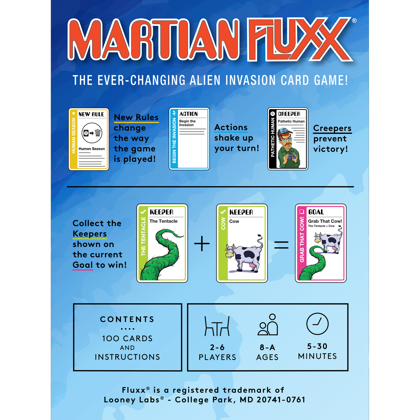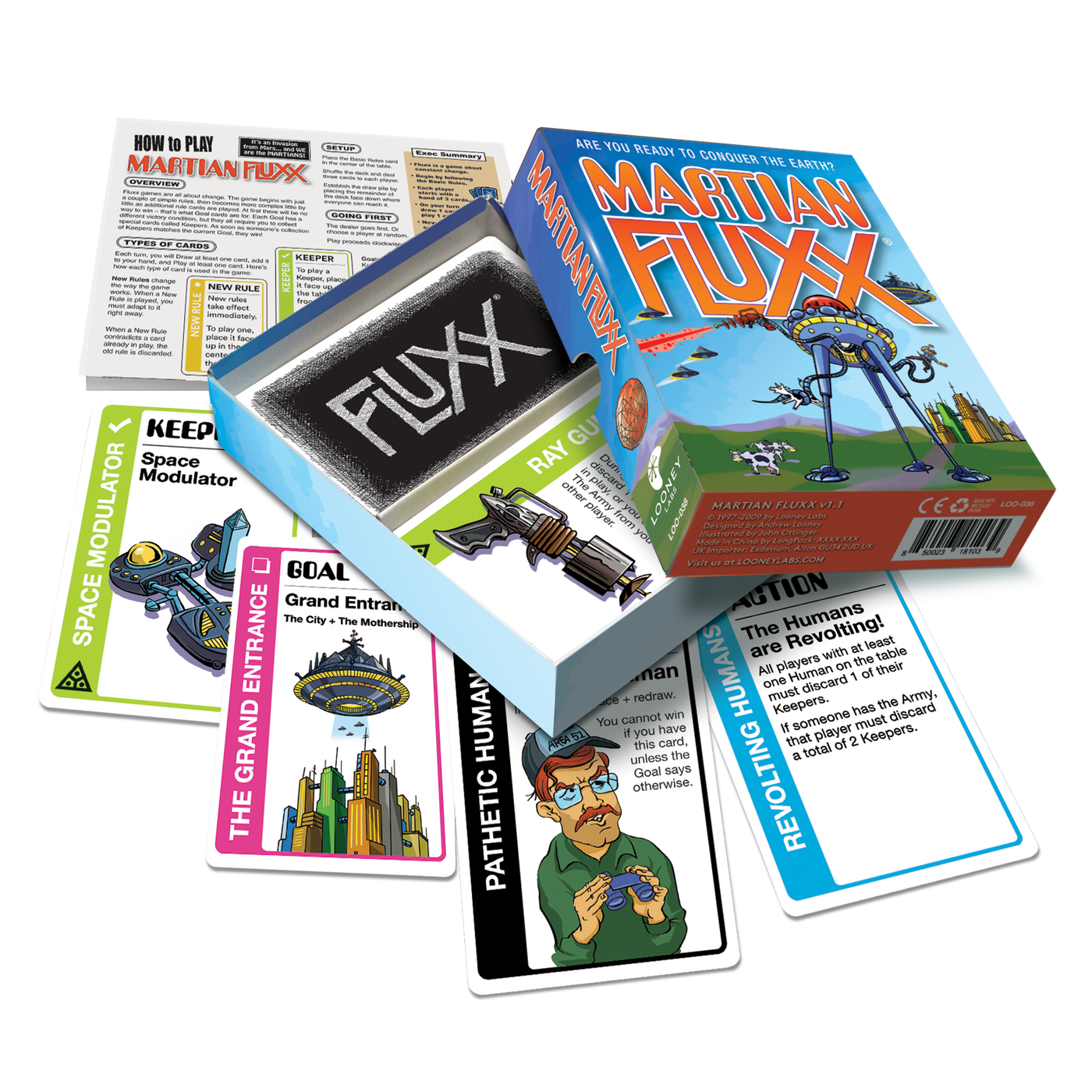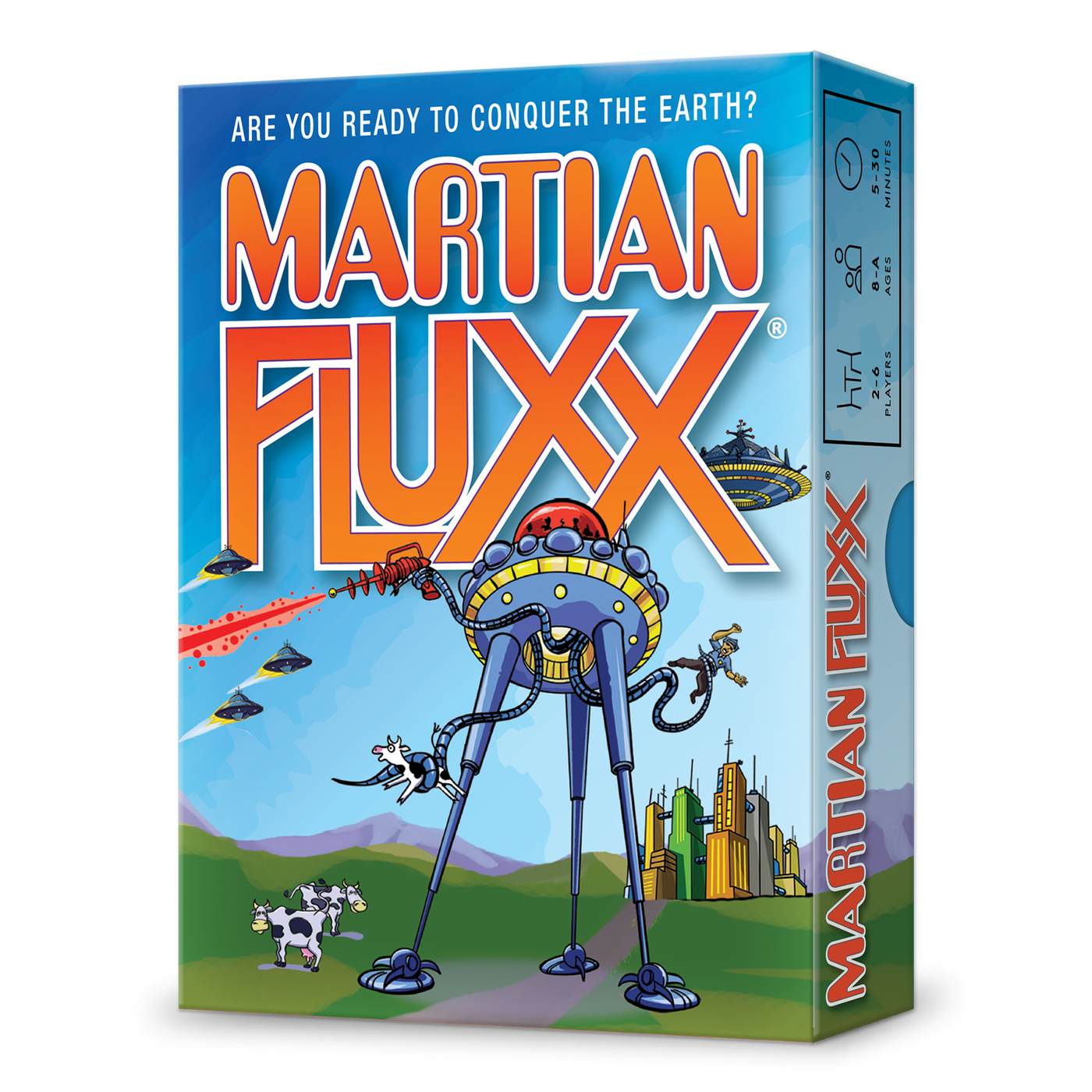 Are you ready to conquer the earth? Martian Fluxx is a classic monster story in ever-changing card game form. It's an Invasion from the Planet Mars! The players are the Martians determined to destroy the Pathetic Humans who are keeping them from winning. It's got Flying Saucers, Giant Tripod War Machines, Tentacles, Ray Guns, a Mothership, and of course, a Space Modulator. Be careful - you don't want your Humans escaping from the Abduction Chamber!