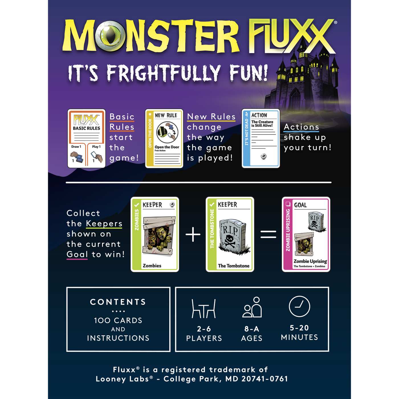 Let the monster mash begin! Classic monster movies and TV shows are the theme in this basic Fluxx deck. Despite the prominent monster presence, this deck is Creeper-free. Designed to introduce new players to the Fluxx system, it has just the four main card types and comes in our standard two-part box.