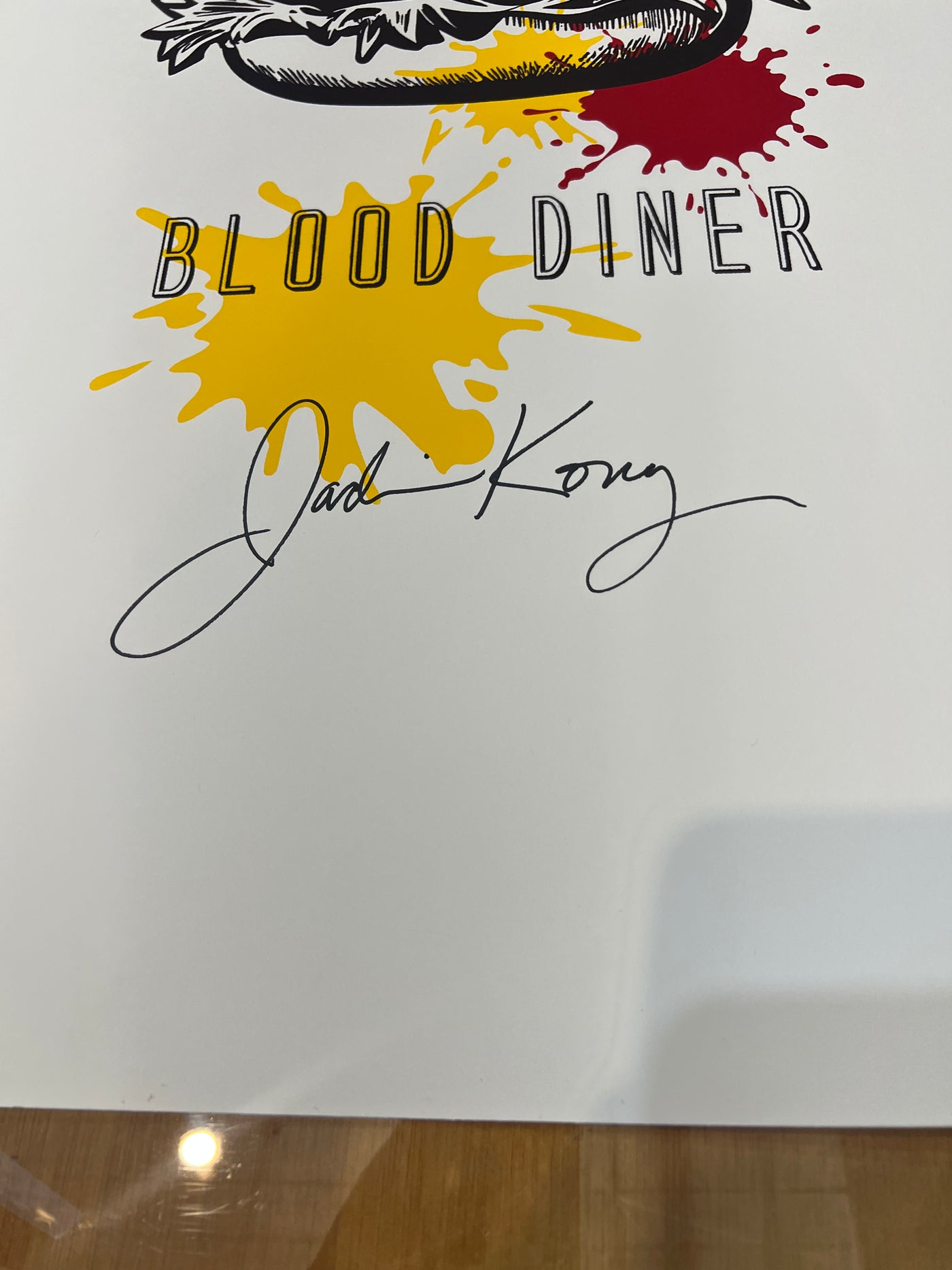 Designed and hand silk screened by me at Coast City Comics for our 2023 showing of Blood Diner. Signed / numbered by me, and autographed huge by Jackie. 22" X 30"