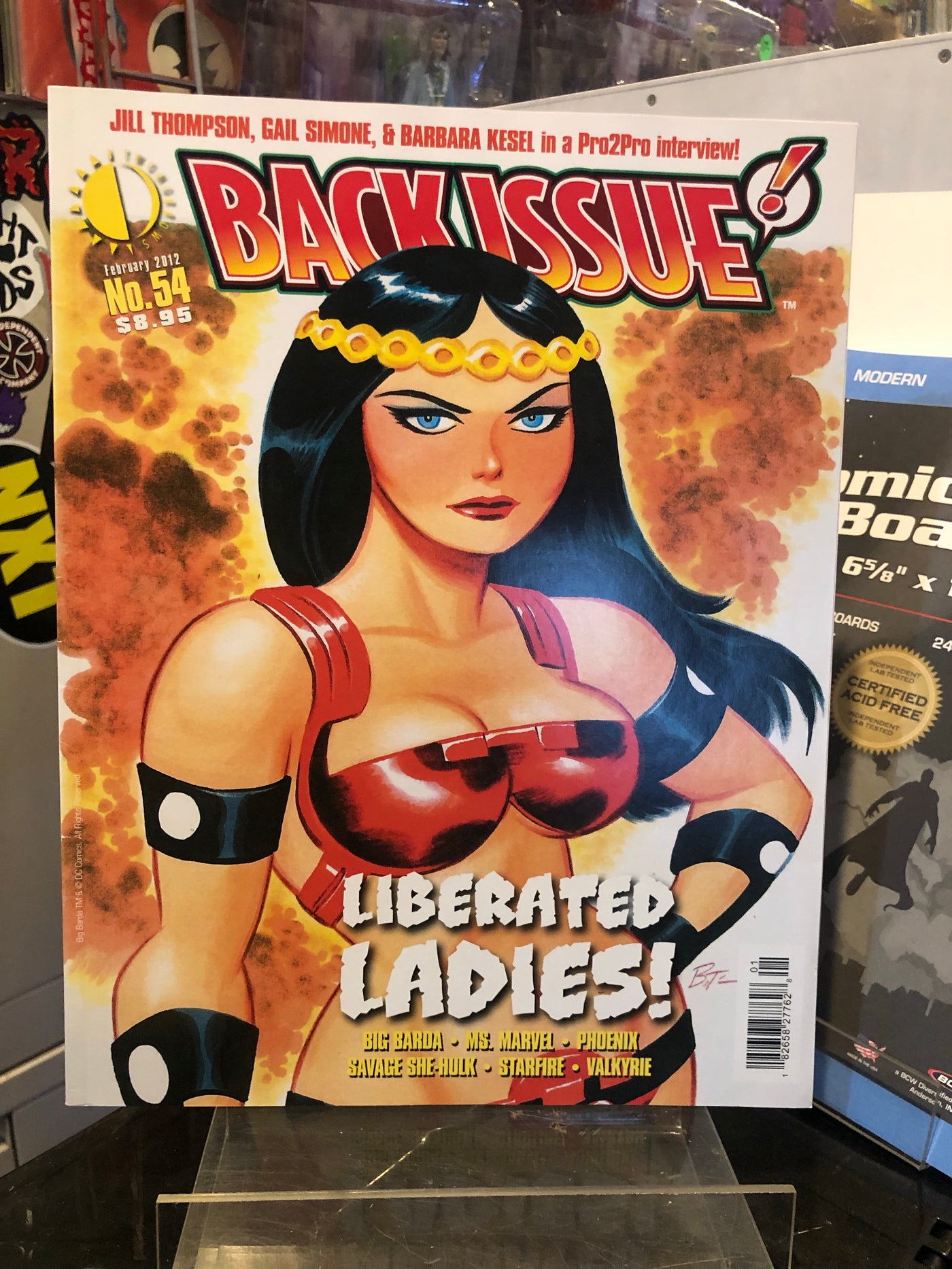 Now in Full-Color! Back-Issue #54 gives equal time to 'Liberated Ladies,' eyeing the female characters that broke barriers in the Bronze Age: Big Barda, Valkyrie, Ms. Marvel, Phoenix, Savage She-Hulk, and the sword-wielding Starfire. Plus, a 'Pro2Pro' interview with creators Jill Thompson, Gail Simone, and Barbara Kesel. Featuring art and/or commentary by John Byrne, George Perez, Jack Kirby, Mike Vosburg, and more, with a bombastic Big Barda cover by Bruce Timm!