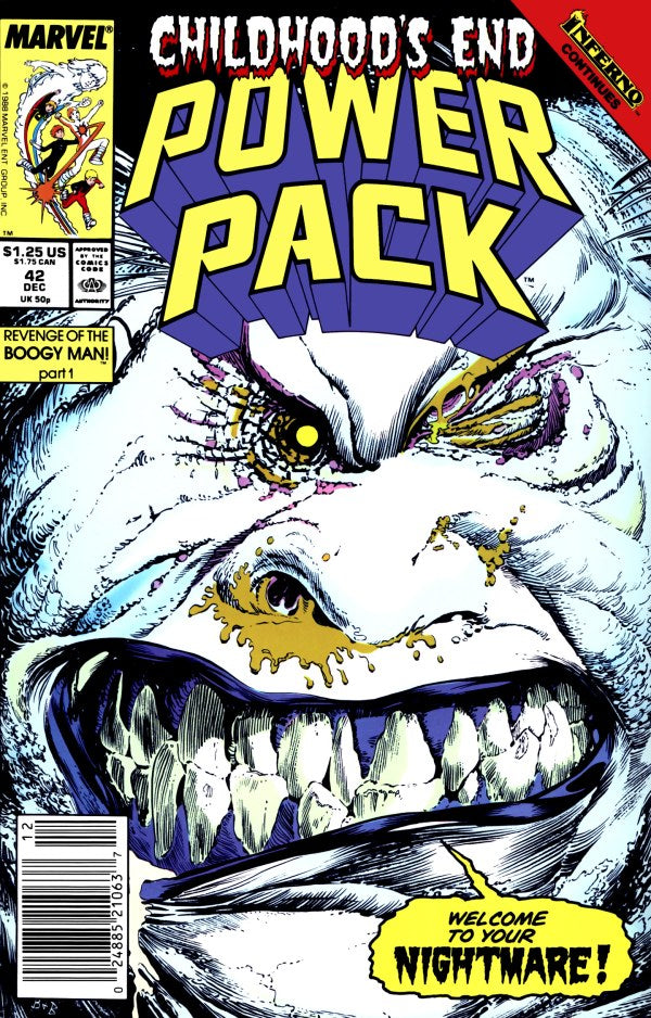 As the Inferno storyline gets under way, the Bogeyman returns from Limbo... as a real Bogeyman! When he takes revenge on Power Pack in front of the kids' parents, it could blow their secret identities forever!