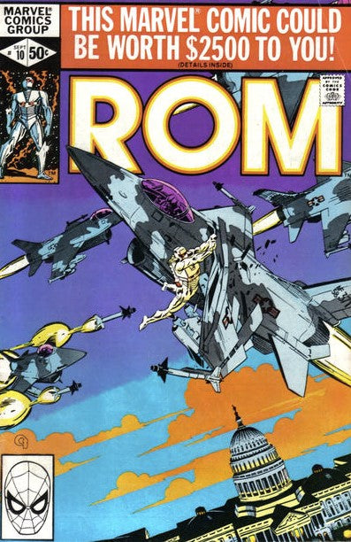 Tracking his stolen Neutralizer to Project Safeguard, Rom descends on Washington D.C. Mistaking the gleaming Spaceknight for some sort of attack the United States Air Force respond in kind. Once again Rom is attacked by those he has come to save. Even a Spaceknight's patience has its limits in "Warrior over Washington!"