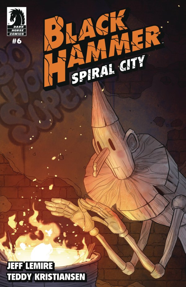 As Spiral PD begins to investigate the death of fallen hero Lady Lark, Wing Man, and Concretestador take justice into their own hands in this penultimate issue! Black Hammer: Spiral City is the next era of the Black Hammer Universe; a seven-issue dystopian event series by Jeff Lemire and Teddy Kristiansen.
