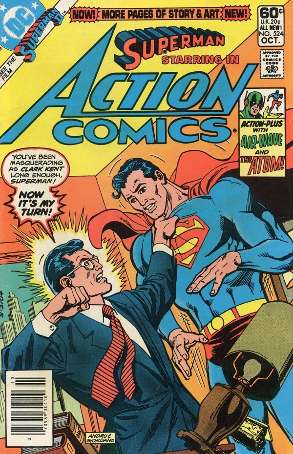 First 60-cent cover price. Cover pencils by Ross Andru, inks by Dick Giordano. "If I Can't Be Clark Kent... Nobody Can," script by Martin Pasko, pencils by Curt Swan, inks by Frank Chiaramonte; A clone of Superman that was created by Lex Luthor tries to take the place of Clark Kent. "Lights... Camera... Crime!" Hostess snack cakes ad with Batman. "Catastrophe By Calculation!", script by Bob Rozakis, pencils by Alex Saviuk, inks by Vince Colletta; The Atom seeks Air Wave's assistance to stop the Calculator.