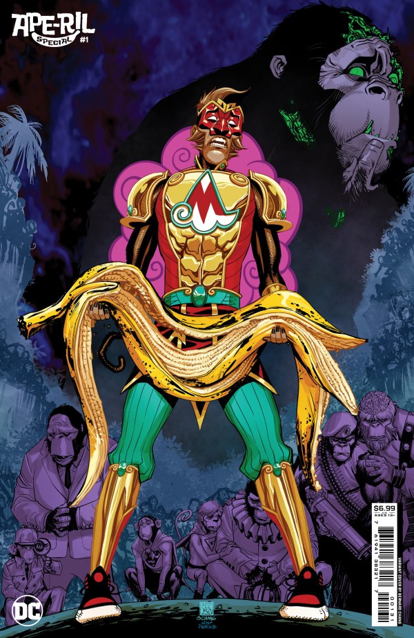 GET READY TO GO BANANAS IN THIS APE-IC ADVENTURE! CAUTION: An ape-surd amount of bad ape puns are incoming. Please be ape-vised. Gorilla Grodd's recent incarcer-ape-tion in the pages of The Flash has left a void that Monsieur Mallah is more than happy to fill. Ape-sembling a group of the DCU's most sinister simians, Mallah forms the Legion of D(oo-oo-ah-ah)m, with an eye toward world domin-ape-tion. But the world won't be conquered that easily! Enter the all-ape JUNGLE L(ee-ee)gue. Can this team of hero-eek anthropoids be the salv-ape-tion we need, or will Mallah's team of maniacal monkeys bring forth the ape-pocalypse? Get ready to go bananas as we honor DC's storied history with mankind's closest relatives in this ape-ic adventure! It's gonna be orangu-tastic, so heat up a capuchin-o, prepare a batch of chocolate chimp cookies, and get ready to r(ee-ee)d the one comic b(oo-oo)k this year that's guaranteed to make you go…APE!
