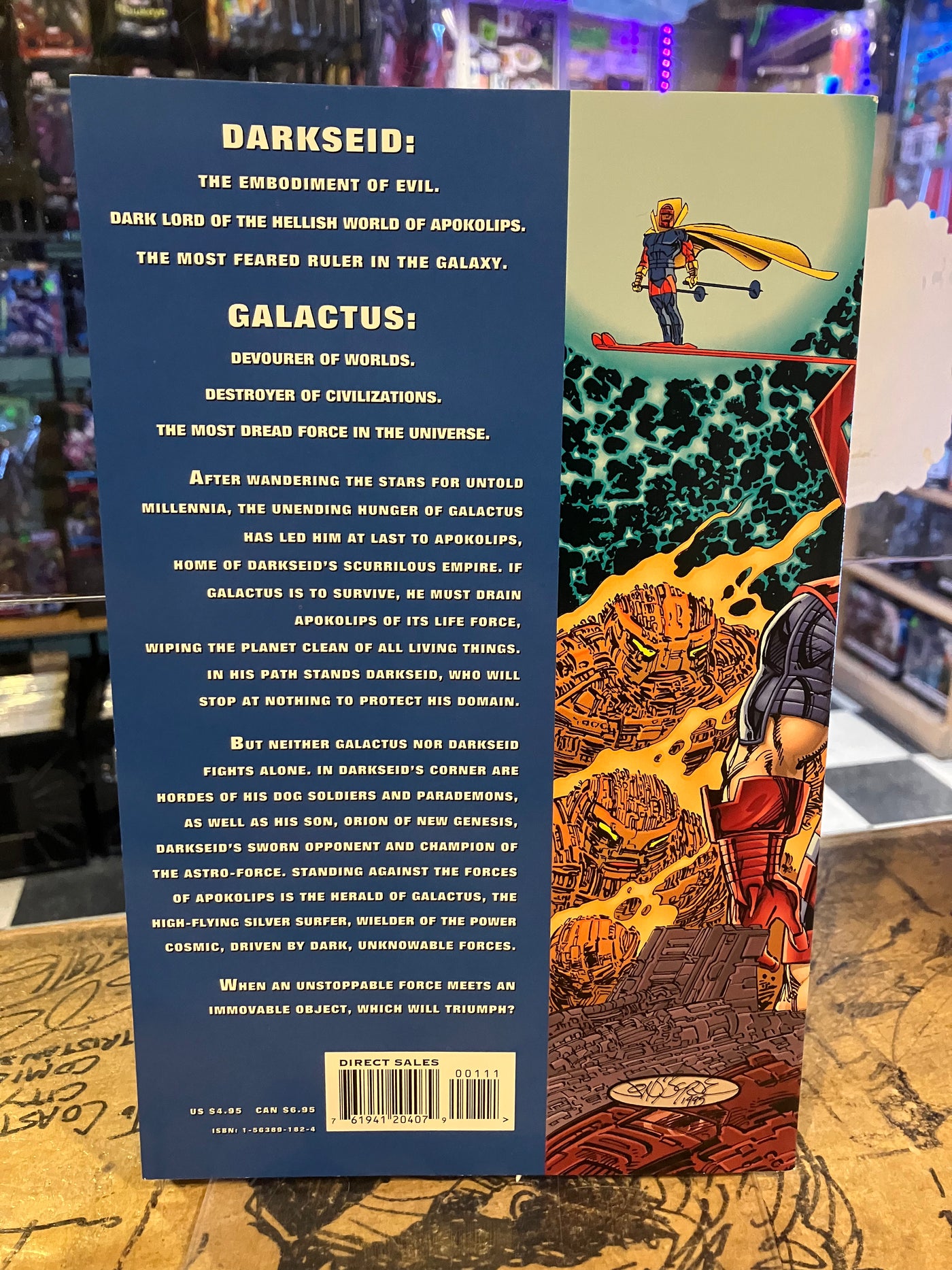 Story and art by John Byrne. 1st printing.Darkseid is the embodiment of evil, dark lord of the hellish world of Apokolips, and one of the most feared beings in the galaxy. Galactus is the Devourer of Worlds and THE most feared being in the universe. Galactus has come to Apokolips to feed and Darkseid is not one to just role over and die. It's Galactus vs, Darkseid. It's Orion vs. the Silver Surfer. The cosmos will quake. When an unstoppable force meets an immovable object, something has to give. Softcover, 48 pages, full color.