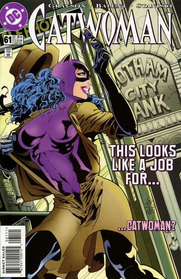 BANK ON IT! City First, a bank in Gotham City, has reopened after sustaining heavy damage during the Quake, and its owner, Norman Safold, claims to the Gotham Globe and Gotham Gazette that the bank is thief-proof. Catwoman is offended. She burns the newspaper and considers the declaration an invitation. She goes to City First Bank as "Lily Sebastian" to rent a safety deposit box. Mr. Harrison explains to her how the boxes' locks operate before excusing himself to allow her privacy with her box. Selina pulls out her Catwoman costume and places it and a recorder inside the box, which she will use to pick up the sound of the bank's security system activating night-mode, which she can use to turn night-mode back off and rob the bank on the easier day-mode setting. When Mr. Harrison comes back, Selina hugs him and says she feels much safer as she takes his copy of the key to her safety-deposit box from his pocket. She asks to go to the bathroom and waits until closing time, but the security guard doesn't appear to turn on night-mode before a gang of masked robbers burst in with hostages. Selina tries to escape to the deposit box room for her costume, but when the robbers catch her as "Lily Sebastian," she can only go along with them and act as a hostage. She acts hysterical until a robber slaps her across the face, and the robbers decide to lock her in the deposit box room until she's calmed down. She continues acting like a terrified hostage until the door closes behind her. Then, she smiles. She changes into her Catwoman costume and sneaks out of the room to save the hostages. She only manages to frighten the robbers, however, and she knows the jumpier they are, the more danger the hostages are in. She says she's unconcerned about the hostages and claims the vault as her own. The robbers ignore her and continue to open the vault while Catwoman pulls herself onto the teller counter and leans back, pressing the button that will turn on the video cameras if you press it once and turn on the silent alarm if you press it twice. She presses it twice. One of the robbers approaches her, and she asks whether they're there for the Brownsley Diamonds. He had no idea that they were there, but once Catwoman tells him where to find them, he runs over to tell his friends... just as the GCPD pull up. The two officers who come to investigate think that the new, high-tech security system is simply oversensitive, and they're unprepared for the armed robbers. Catwoman prepares them by jumping one of the robbers, which warns them of what's coming before they walk into a slaughter. The two sides exchange fire while Catwoman flips out of the way. When one of the robbers tells the police they have hostages, she chimes in "Six! and four gunmen!" One of the officers calls it in as both sides retreat. One of the robbers goes to check on the hysterical prisoner they locked in the deposit box room, and he hears frantic pleas as Catwoman jumps down and kisses him. He asks what that was for, and she replies, "Not shooting at cops." The robbers know the cops will return with backup. Catwoman takes a gun from one of the robbers and suggests killing the hostages, which shocks the robbers who know the hostages are their only protection from the cops. She tells them she'll testify she hired the robbers to work for her, and then they'll be charged with a lot more than attempted armed robbery... The leader says it's time to cut their losses, and the four robbers go to surrender to the police. Catwoman throws down the gun and assures the hostages she doesn't kill. The hostages run for the doors, but Mr. Harrison insists on staying behind while Catwoman gets "Lily Sebastian" out of the deposit box room. He listens to the two women arguing for several minutes until "Lily Sebastian" is thrown out of the room and into his arms. She tells him and the police that Catwoman got away by climbing through the air vent. Outside, Mr. Harrison tells the police that the security system never went into night-mode, and he insists that everyone--even the hostages--be checked over in case it was an inside job. Mr. Harrison submits to a pat-down first, then so does "Lily Sebastian." She's all-clear. The next day, "Lily Sebastian" returns to the bank to go into her safety deposit box again. Mr. Harrison excuses himself to give her some privacy, and once he's gone, she pulls out the Brownsley Diamonds.