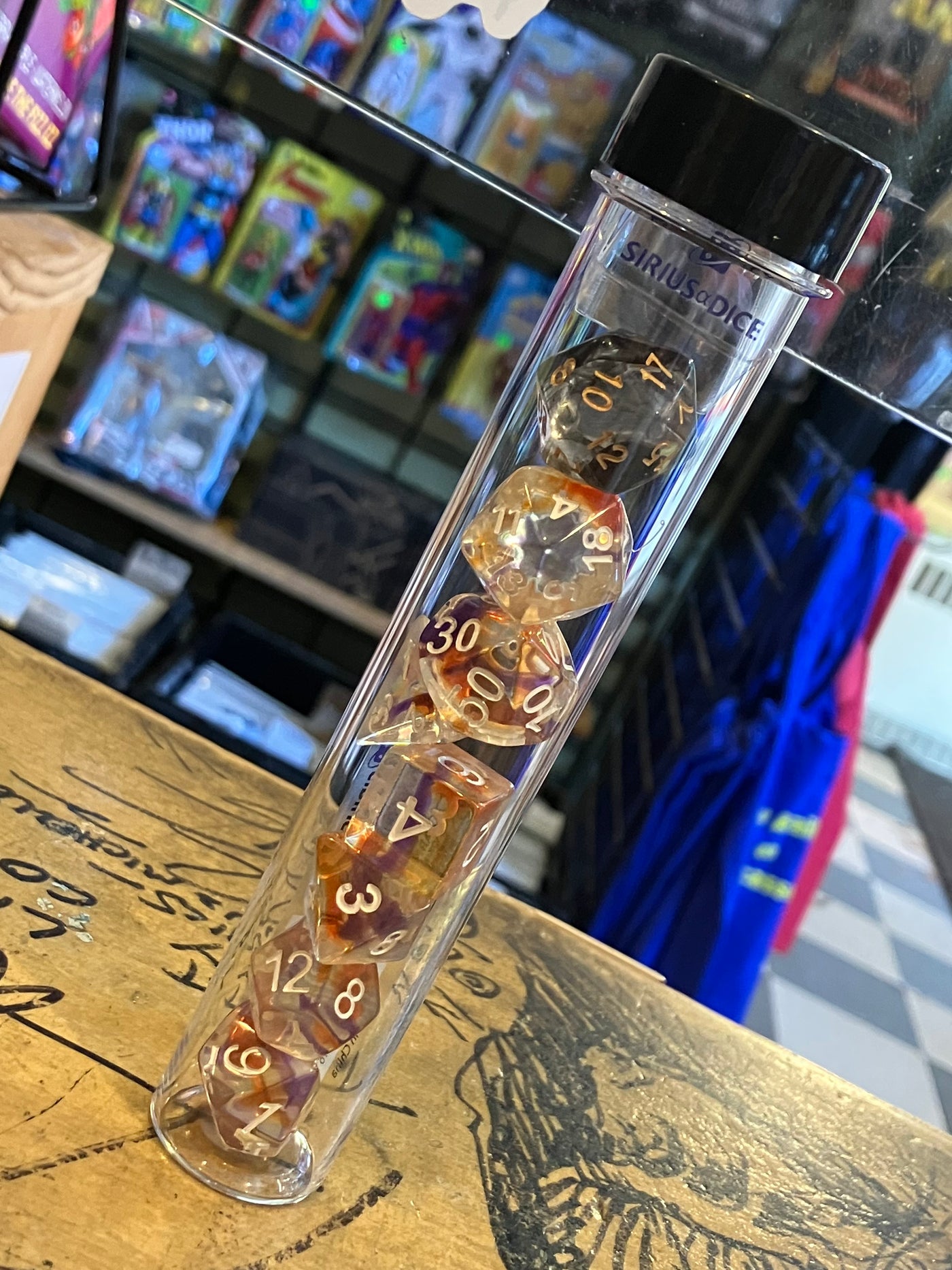 Set of 7 polyhedral dice plus 1 extra D20. Packaged in a flat-bottom tube, so you can easily carry and store your dice. Style: Purple, Orange Clear