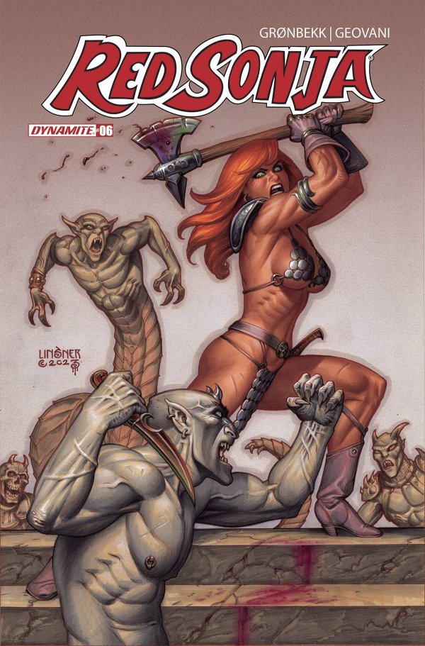In this issue: Chaos, blood, and magic all run riot in the streets as the figure behind "His Master's Voice" stands revealed! Varg faces off against [REDACTED] and the winner of that fight will turn their fury on Red Sonja in a battle for the very soul of Hyboria!