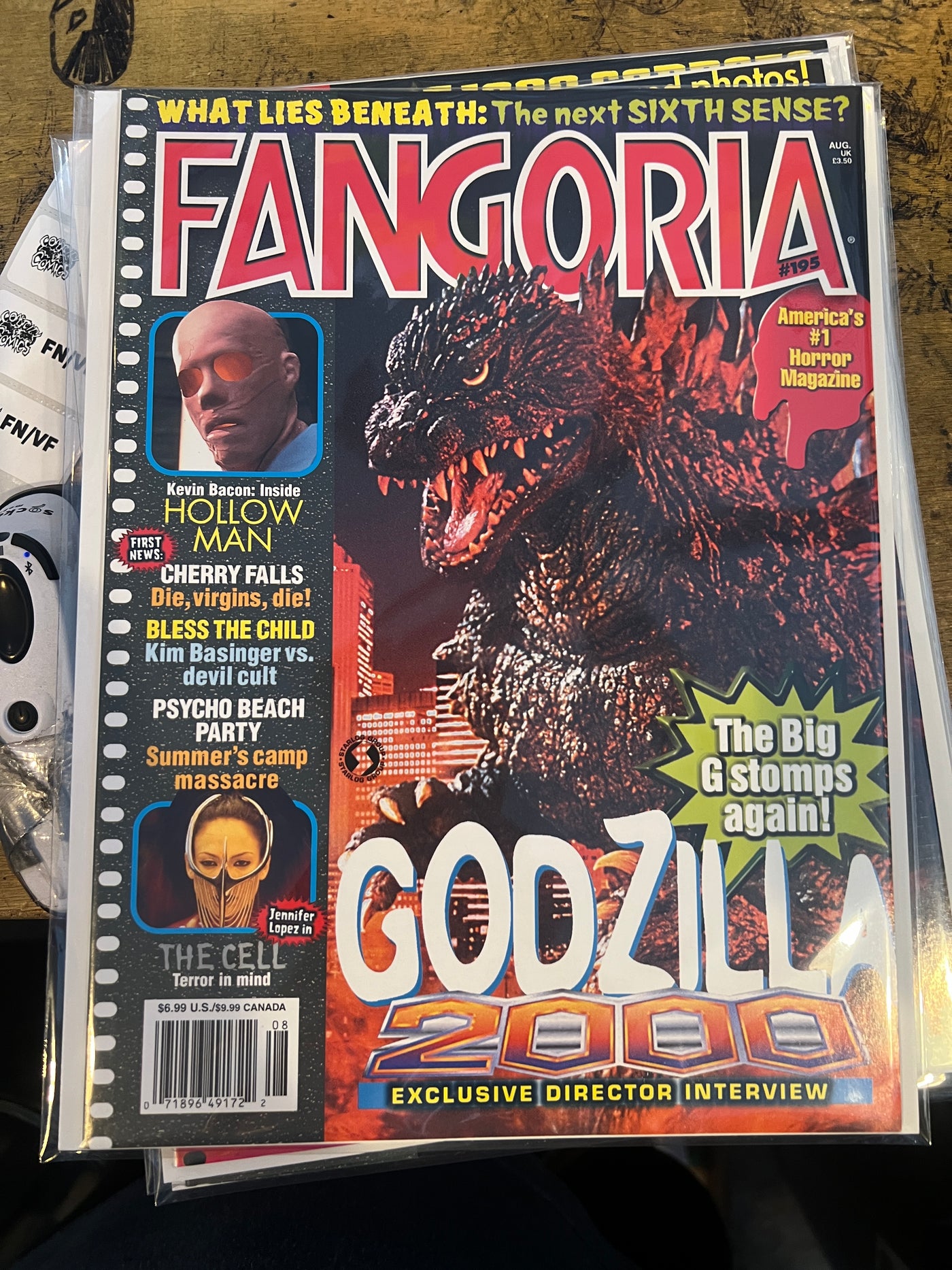 Godzilla 2000; What Lies Beneath; Hollow Man - Kevin Bacon; news on Cherry Falls; Bless the Child - Kim Basinger takes on devil cult; Psycho Beach Party; Jennifer Lopez in The Cell.