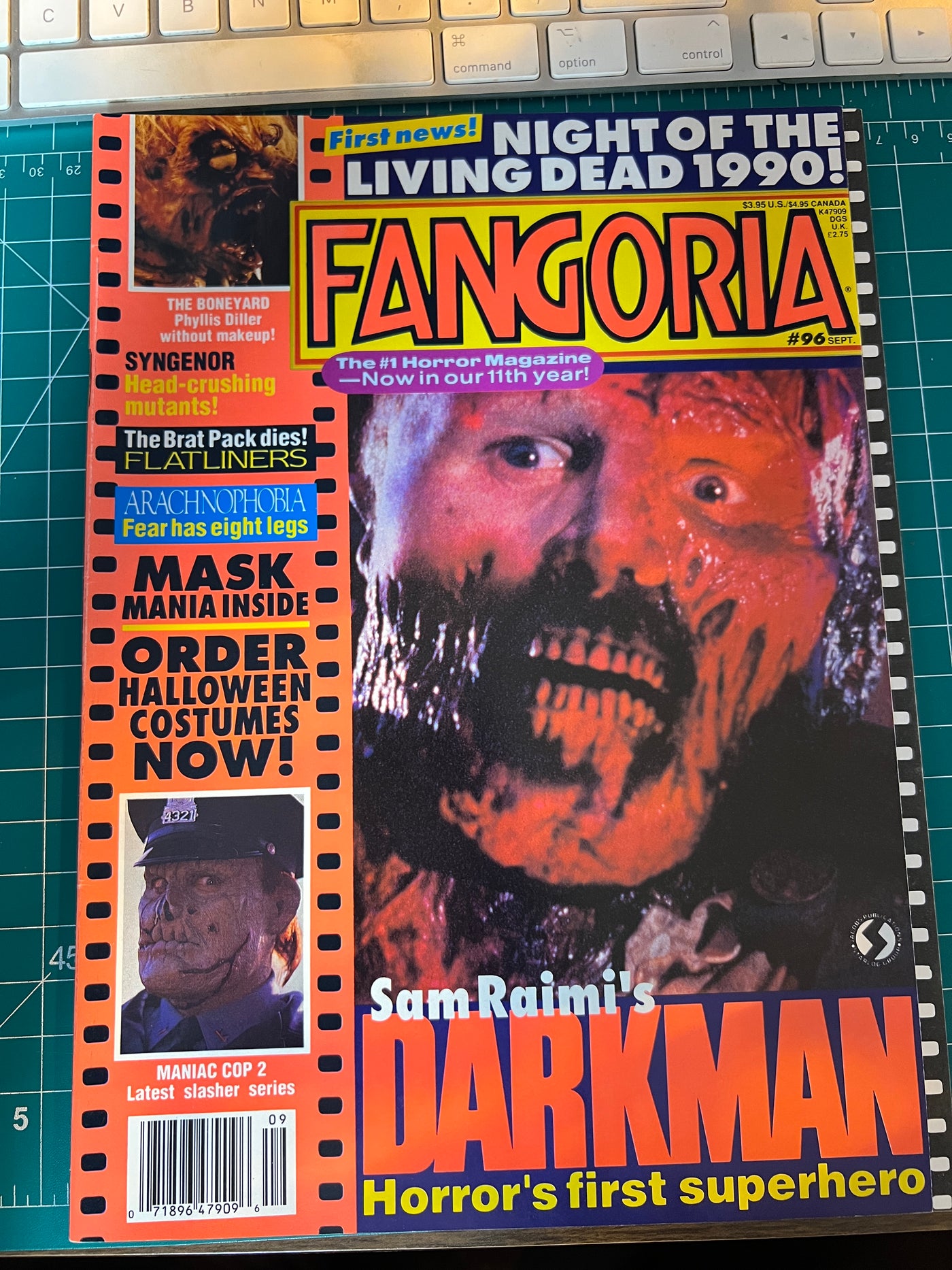 AIP's Louis Heyward remembers working on horror films; Dick Miller returns for Gremlins 2; features on The Boneyard and Manic Cop 2; Sam Raimi on Darkman; a feature on FX man Mark Williams; Frank Marshall directs Arachnophobia; an interview with novelist Chet Williamson; a Gremlins 2 poster; and more. Cover depicts Darkman.