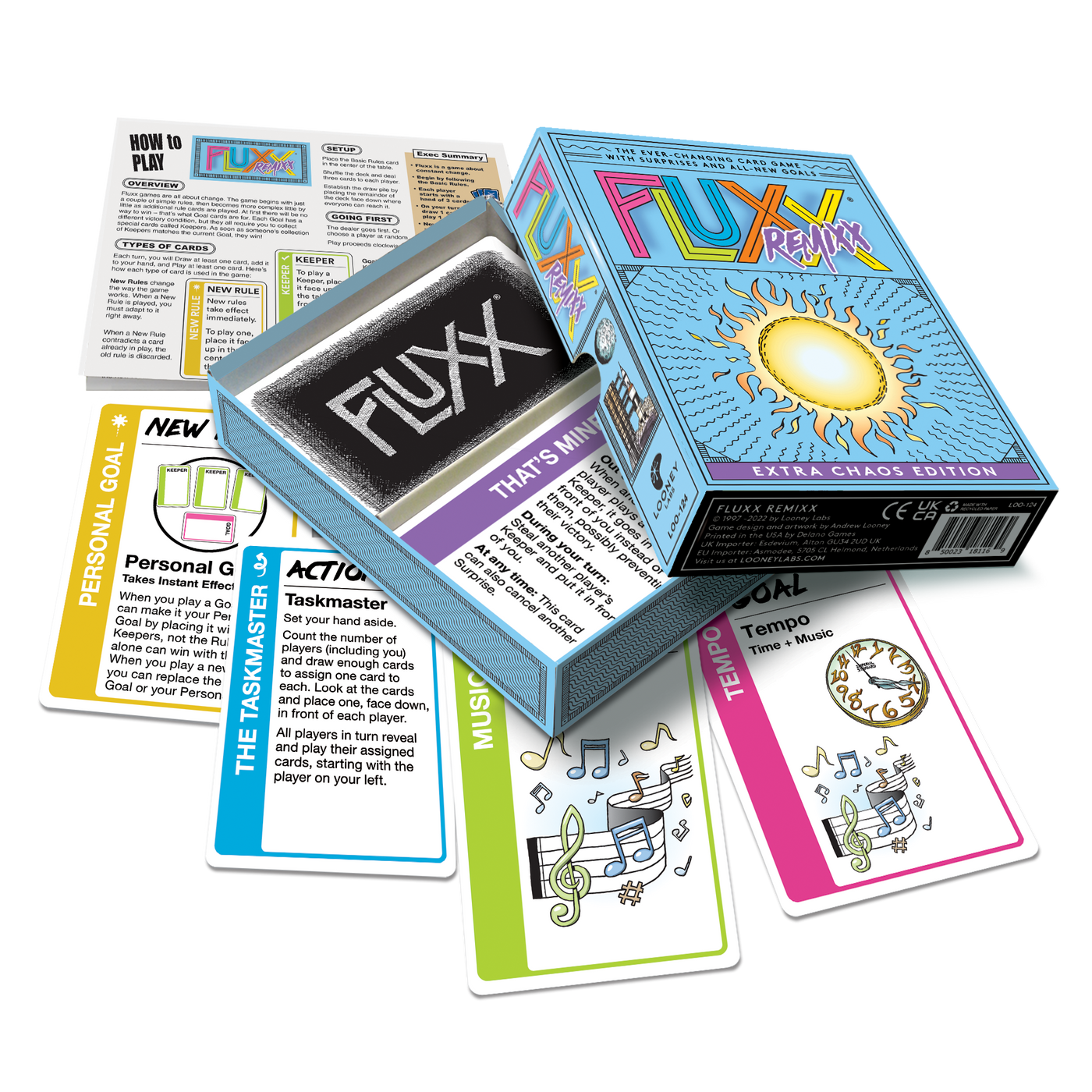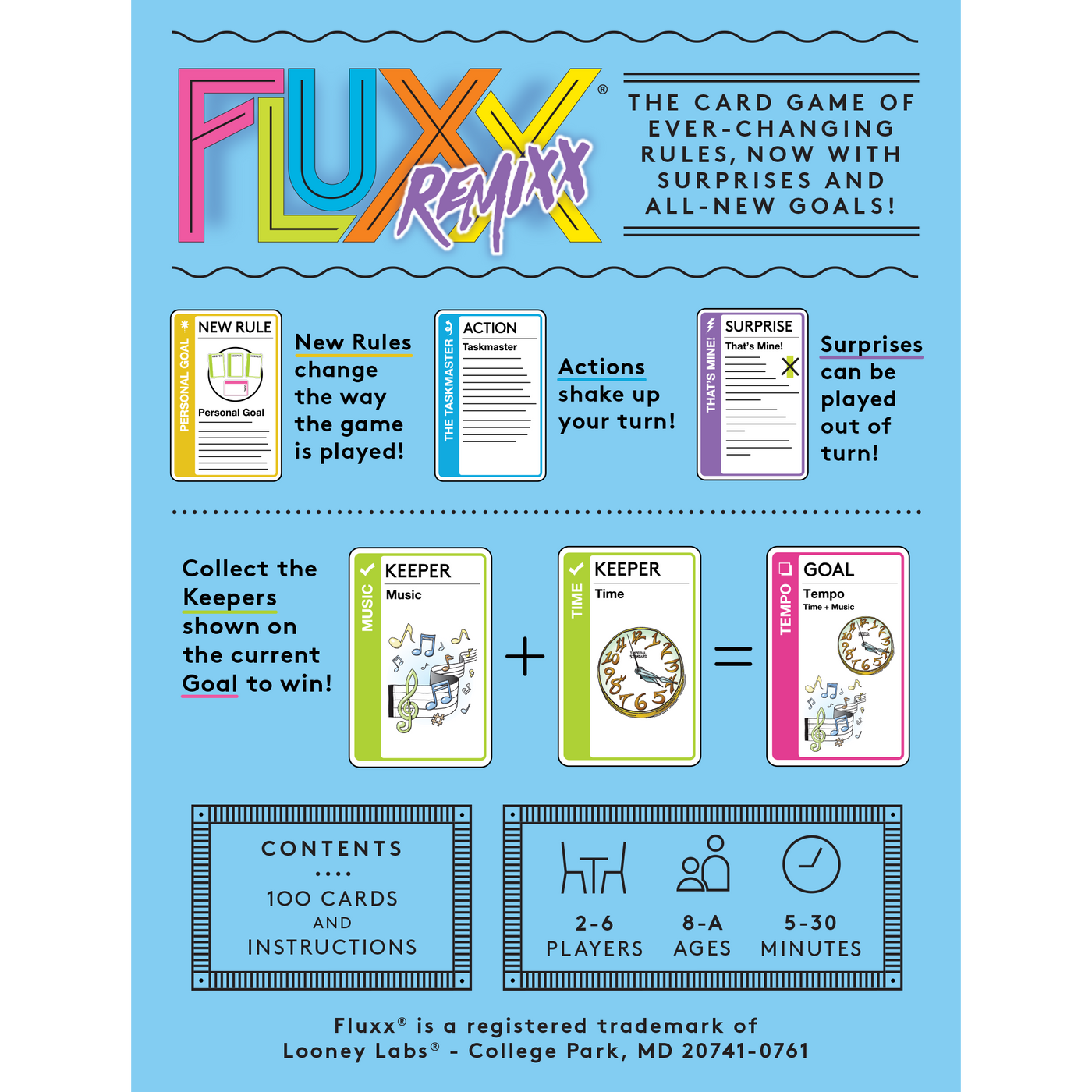 looneylabs.com/MAPP - Minimum Advertised Price: $19.95 What do you get when you start with the familiar Keepers from Fluxx and reimagine everything else? Fluxx Remixx! This version of the base game is intended to be a little more advanced and a little more chaotic than the "milk and cookies" version. With a whole new slate of Goals to work toward and New Rules, Actions, and Surprises that keep things hopping, you can be sure zaniness will ensue! And since this is a "remix," it's got musical references throughout, just for the fun of it. Here comes the sun! Players: 2-6 players | Ages: 8+ Comes with a free colorful display when you buy 6 copies!