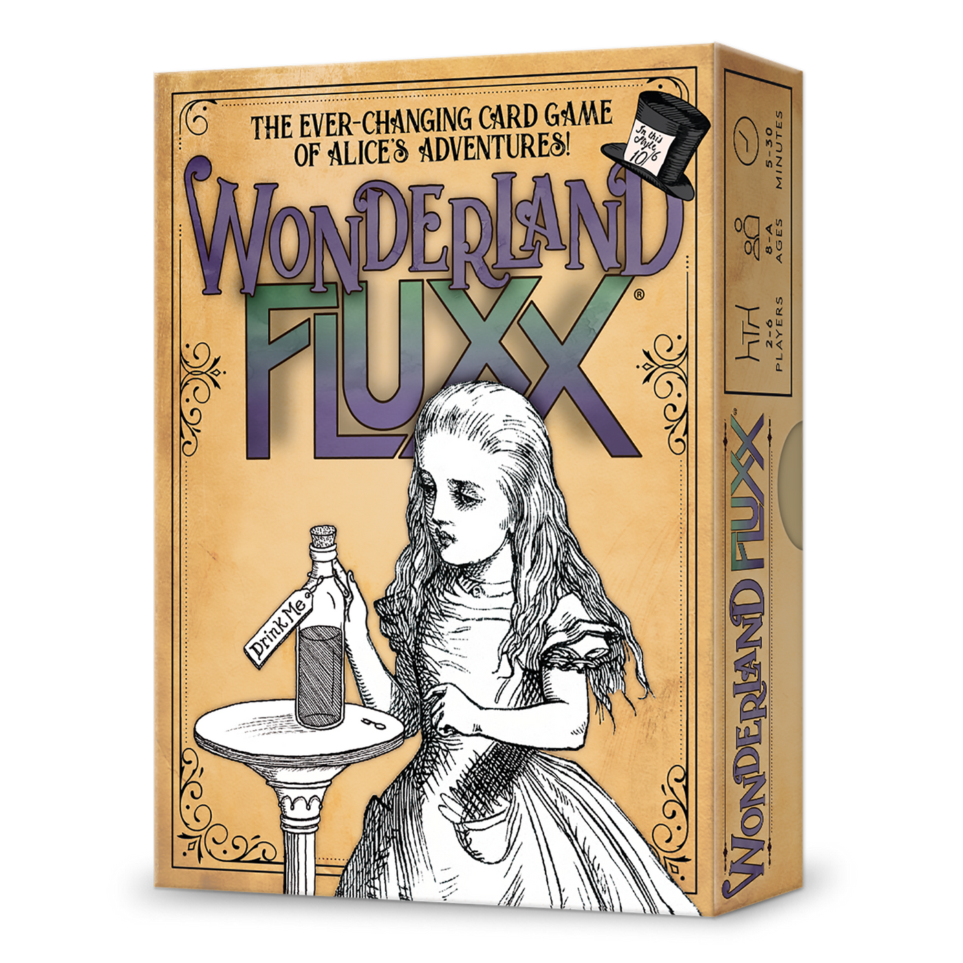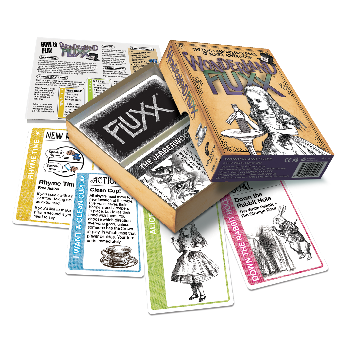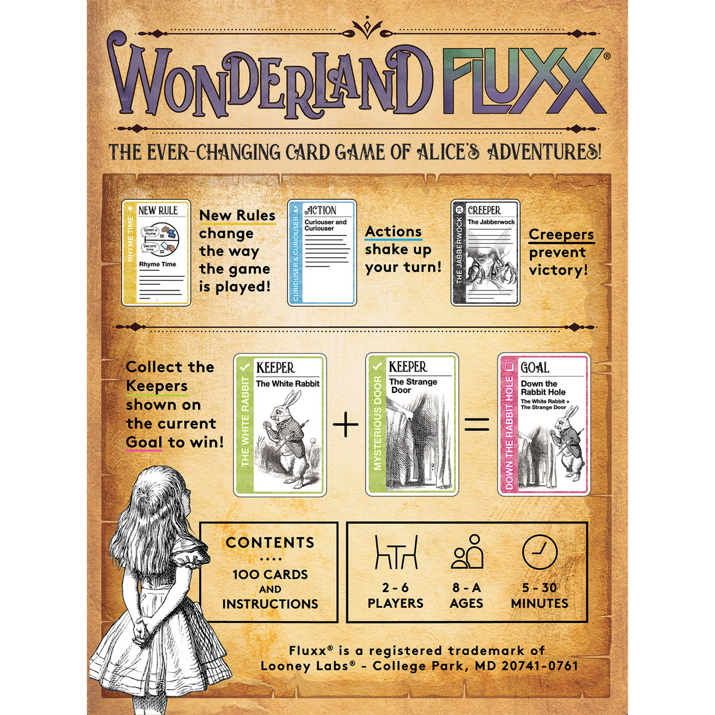looneylabs.com/MAPP - Minimum Advertised Price: $19.95 What’s more topsy-turvy than Fluxx? Wonderland Fluxx! Go down the Rabbit Hole with Looney Labs in their latest literary send-up. Join Alice as she has tea with the Mad Hatter, gets directions from the Cheshire Cat, tries to reason with Tweedle Dee and Tweedle Dum, and grows and shrinks alarmingly. You may even need to slay a Jabberwock to win at this even curiouser version of Fluxx. Players: 2-6 players | Ages: 8+ Comes with a free colorful display when you buy 6 copies!