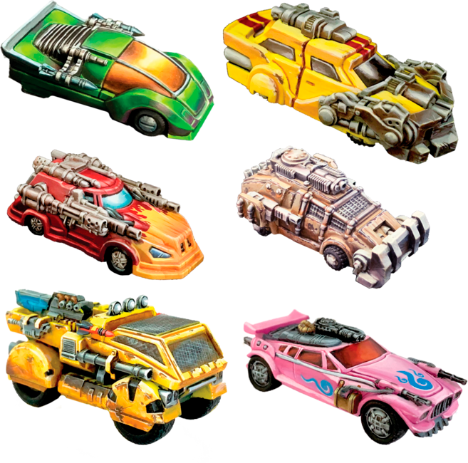 A complete redesign of the original game of autoduelling, Car Wars Sixth Edition plays faster and includes new plastic miniatures! This Starter Set has everything that two players need to start play. * Six unpainted miniatures: Scarab, Warhawk, Hotshot, Hammer, Butcher, and Typhoon. * Two car bases (one blue and one green) * Two dashboards (one blue and one green) * Over 100 game cards * Four counter sheets (dashboard sliders, barrier and wreck tokens, two turning keys, and other assorted tokens) * Dice pack (20 dice: six yellow, four blue, three red, three green, two black, and two white) * Six double-sided vehicle record sheets * Rulebook Miniatures come pre-assembled and unpainted.