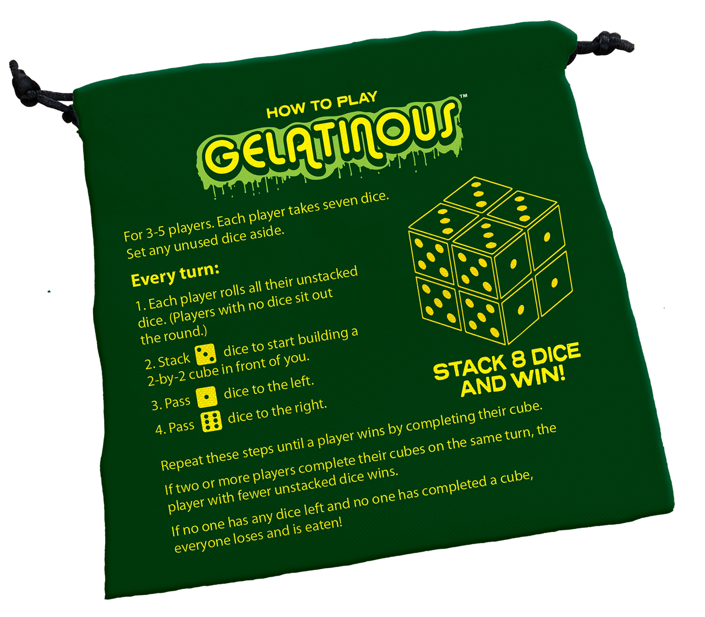 Be the biggest ooze . . . or lose! In Gelatinous, players start out as a wandering slime, using sparkling green dice to grow into a cube. But watch out, the other slimes are growing too! The first to grow into a cube wins – and the rest are lunch. Includes 35 glittery green dice and its own dice bag! Bonus Solitaire rules: Don't have any other slimes to play with? We've got you covered! Download our Solitaire rules here. We even have video guidelines available so you can play with your friends by video chat! Game Design by Philip Reed Developed by Randy Scheunemann Cover art by Gabby Ruenes