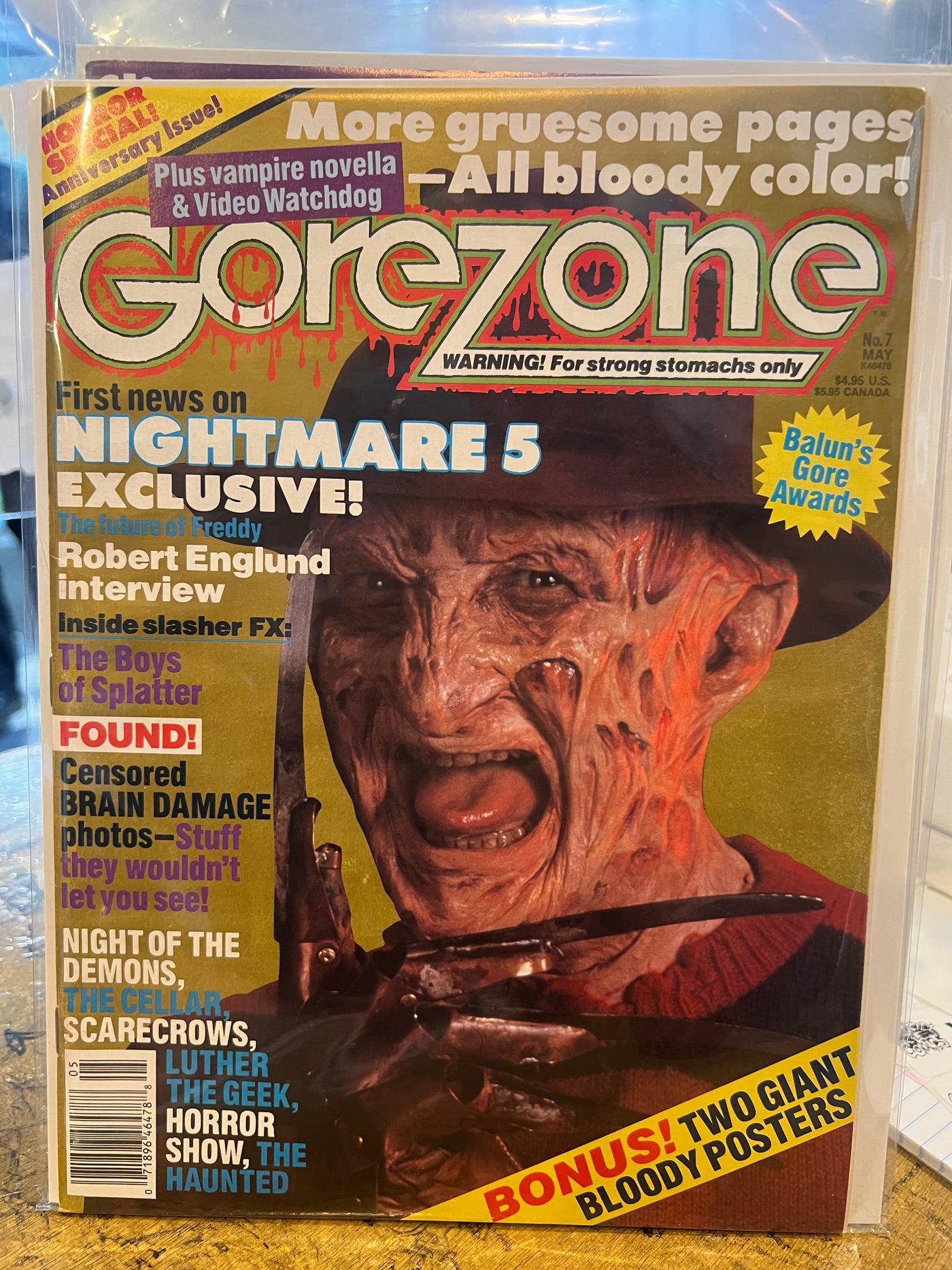 Horror Special - Anniversary Issue. Warning -- for strong stomachs only! First news on Nightmare 5; the future of Freddy - Robert Englund interview; inside slasher FX - the boys of splatter; censored Brain Damage photos - stuff they wouldn't let you see; Balun's Gore Awards; vampire novella; Video Watchdog; two giant bloody posters. Plus: Night of the Demons, The Cellar, Scarecrows, Luther the Geek, Horror Show, The Haunted.