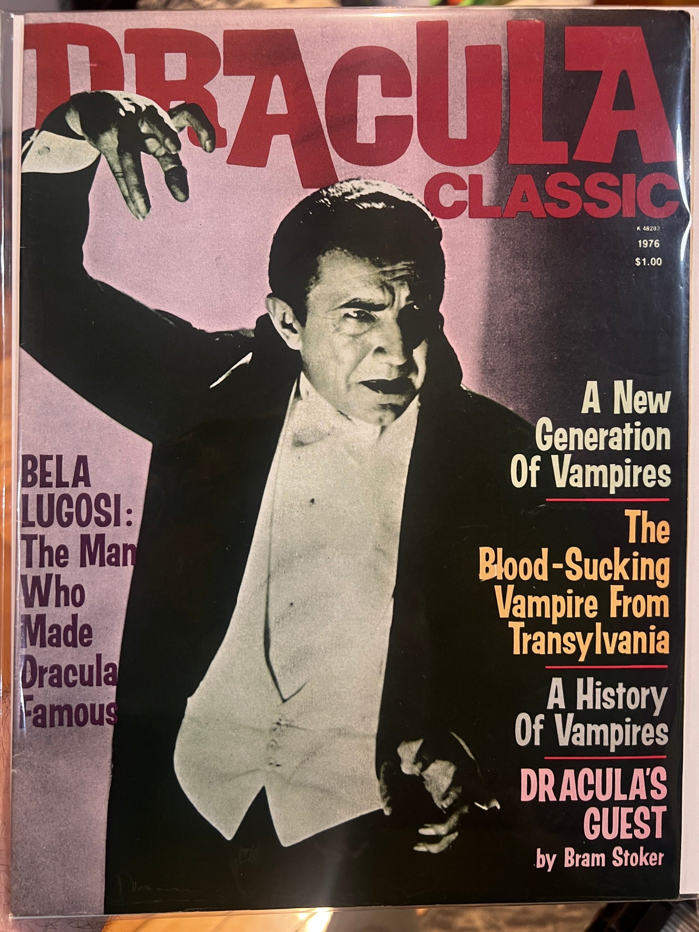 Emerging from the cobwebs of his decaying castle, he uttered to Renfield the immortal words, "I am Count Dracula, I bid you welcome." Dracula Classic (1976) was a horror magazine published by Eerie Publications. This edition consists of short stories and articles accompanied by B&W photos of Dracula as portrayed by Max Schreck, Bela Lugosi, and Christopher Lee. Includes "The Corpse that Walked by Night" by John Thomas Church, "Bela Lugosi: The Man Who Made Dracula Famous," "A History of Vampires," and "Dracula's Guest" by the father of the modern day gothic horror, Bram Stoker (a must-read for any Dracula fan).