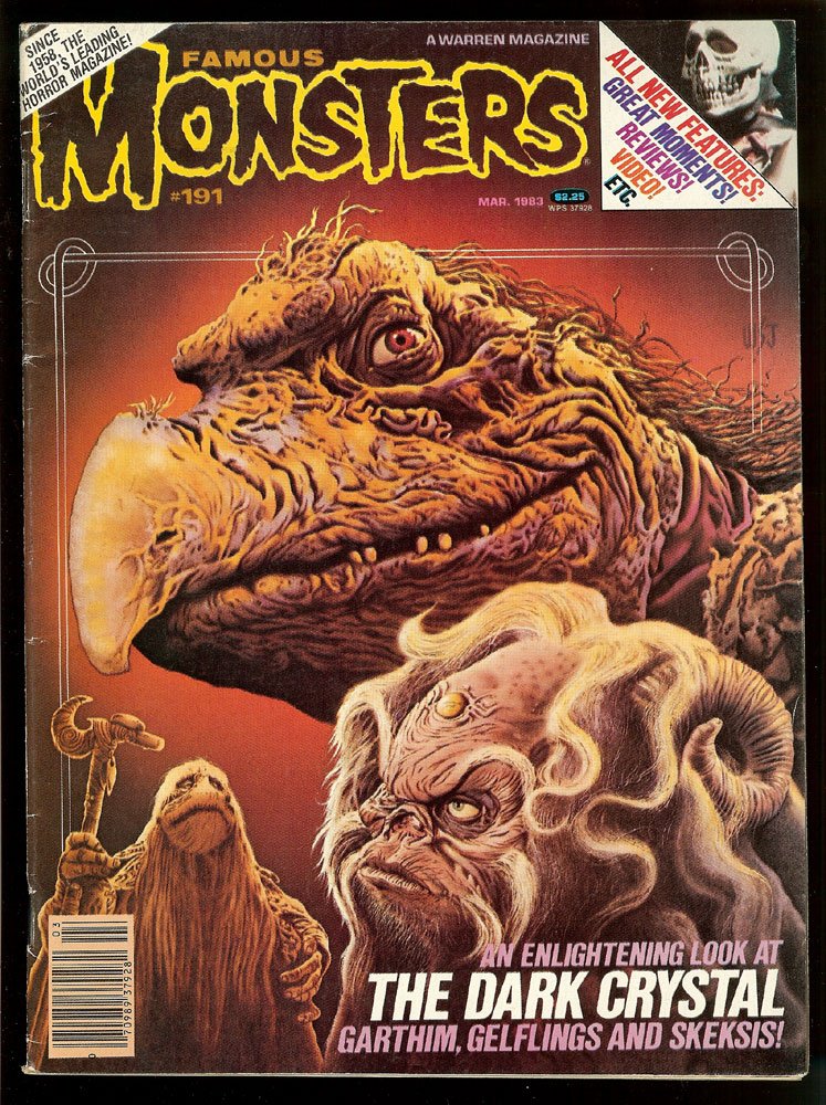 Features in this issue include: the announcement of Forrest J Ackerman resigning as FM Editor-in-Chief; Forry retrospective and farewell article by Randy Palmer; The Dark Crystal preview; videogame article by Jeff Rovin; reviews of The Road Warrior, Halloween III, The Funhouse, and other films; role playing game article by Jeff Rovin; article on computer animation by Roscoe Pound; The Time Machine filmbook part two; and more. Uncredited cover painting depicts creatures from The Dark Crystal.