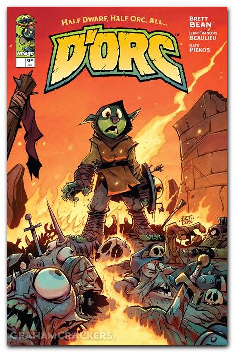 Special preview of D'orc as they're armed with nothing but a magical yet ambitiously violent shield, a lonely orphan stumbles headfirst into Sunderaine’s never-ending war between the Light and Dark. Elves vs. Orcs. Wizards vs. Common Sense. Dragons vs. Literally Everyone. And caught dead-center? D'ORC. With a wholly inconvenient doomsday prophecy, the half dwarf, half orc—all D'ORC—is fated to end the world. Soon, every human, elf, goblin, dwarf, Snargletooth, Necroid, Ice Giant, Trauma Llama, and at least three other unpronounceable magical creatures, will know his name and want him dead. There will also be a chicken. Join fan-favorite artist BRETT BEAN (I HATE FAIRYLAND, DUNGEON CRAWLER CARL THE CROCODILE), colorist JEAN-FRANÇOIS BEAULIEU (I HATE FAIRYLAND), and letterer NATE PIEKOS (MINOR THREATS) for a hilarious high-fantasy romp perfect for fans of CONAN, LORD OF THE RINGS, and of course, GERT's deadpan humor.