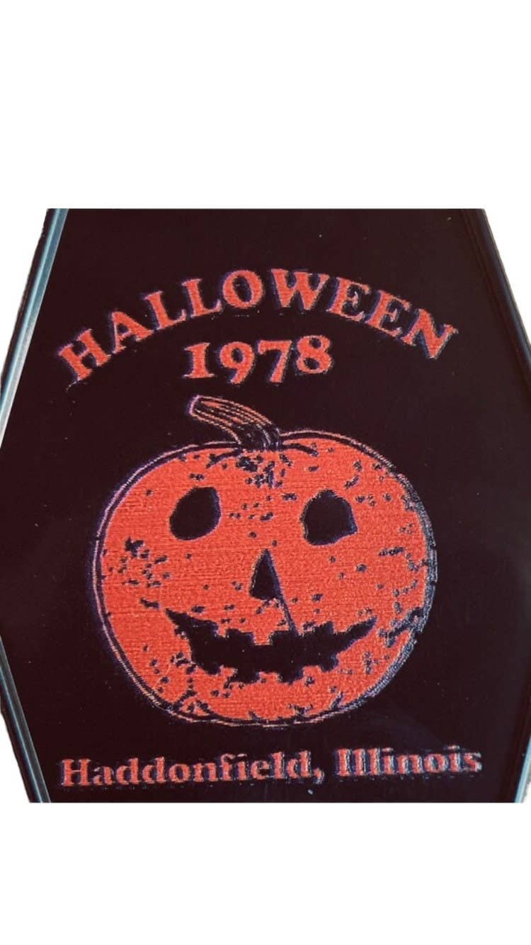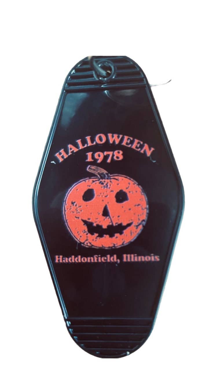 Halloween Inspired Haddonfield Keytag. Unlock the terror of the Halloween season with this must-have key tag for any fan of the classic horror movie. Featuring a bold pumpkin head prominently displayed in bright orange against a sleek black background, this durable plastic tag is sure to be a haunting addition to your collection. Measuring approximately 3 1/2" x 1 1/2", it's the perfect size to hold all of your important keys. Don't miss out on this spine-chilling opportunity - order now! Please note, this key tag is single-sided printed.