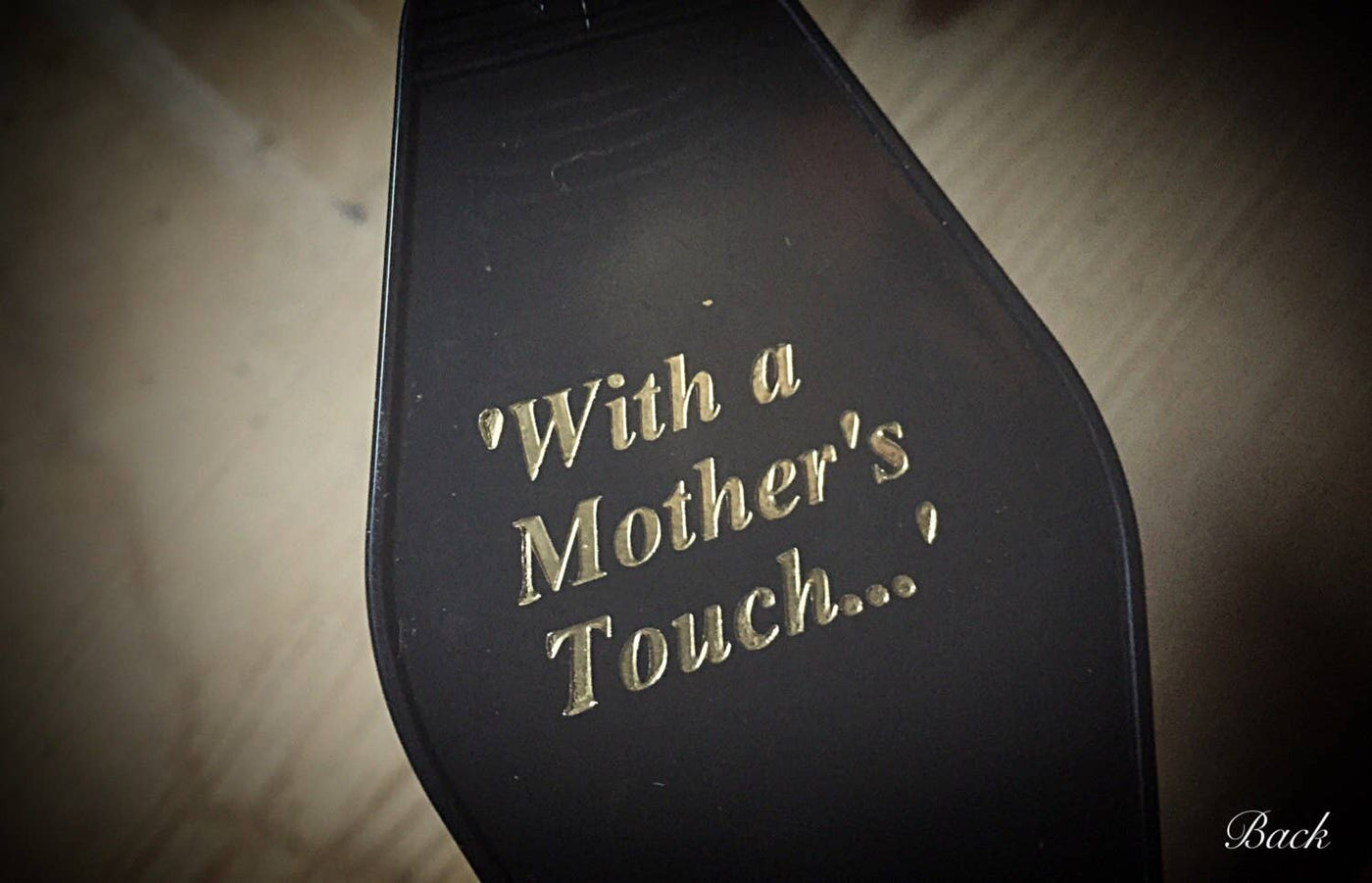 Psycho Inspired Bates Motel Keytag. A brand new Bates Motel Cabin 1 keychain that is an amazing tribute to arguably the most iconic horror film in cinematic history ....... GOLD PRINTING ON FRONT "PSYCHO"! This eerie prop measures 3.5" long, boasts vibrant graphics, and is made of a durable plastic. Front side print only Handmade at our California based shop. MADE IN THE USA