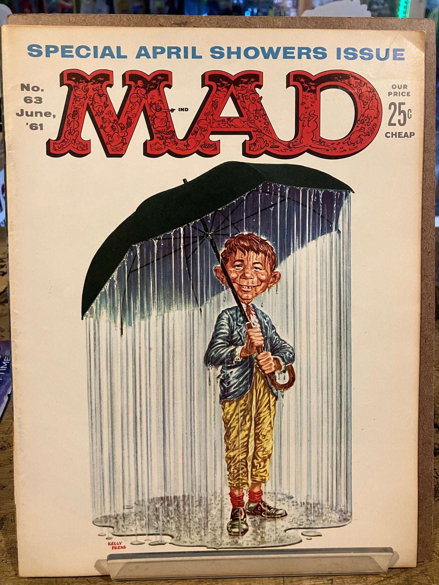 Cover art by Kelly Freas. "Mad's Modern Elementary School Text Books," script by Tom Koch, art by Dave Berg; Updating school text books with modern pictures and references. "What's in a Name?", script by Phil Hahn, art by Mort Drucker; Contrasting the historical definitions of common names with celebrities who have those names. "Specialized Breakfast Foods," script by Bob Margolin, art by Bob Clarke; Breakfast cereals marketed to specific demographic groups. "At the Knife-Throwing School," script and art by Don Martin; A man is instructed on the proper form to throw a knife. "Adult TV Cartoons," script by Al Jaffee, art by Wally Wood; If other cartoon series lifted their premise from established television shows, as The Flintstones were accused of doing from The Honeymooners. "Magazines For Senior Citizens," script by Tom Koch, art by George Woodbridge. "How To Improve America's Prestige Abroad," script by Frank Jacobs, art by Joe Orlando; Various stereotypical Americans relate their ideas to improve the country's image. "Spy Vs. Spy," script and art by Antonio Prohias; The White Spy booby-traps the Black Spy's phone. "The Minute After That One Minute TV Commercial," script by Sy Reit, art by Bob Clarke; Continuing the action of various television commercials after the camera has stopped. "In the Park," script and art by Don Martin. "The Great Magazine Circulation Drive," script by Larry Siegel, art by Joe Orlando; A magazine publishing company badgers a person to subscribe. "A Mad Peek Behind the Scenes," script and art by Dave Berg; Behind the scenes at various businesses. "Paperback Roulette," script by Sy Reit, art by Bob Clarke. "How to Read Between the Lines and Fill In Those Little Dots in a Gossip Column," script by Don Reilly, art by George Woodbridge; Filling in the facts that Hollywood gossip columns leave out. "The Pickpocket," script and art by Don Martin. "Mad Visits John Wayde on the Set of The Alamo," script by Larry Siegel, art by Mort Drucker; Satirical look behind the scenes at the filming of the John Wayne film "The Alamo." Parody of Budweiser Beer print ads, art by Kelly Freas. 52 pgs., B&W.