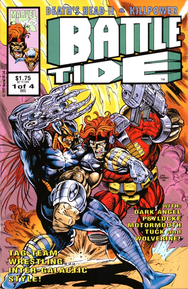 Tag-team wrestling--inter-galactic style! It's everyone's favorite cyborg vs. everyone's favorite assassin as Death's Head II and Killpower find themselves in a world where war is an everpresent reality. With Dark Angel, Psylocke, Motormouth, Tuck & Wolverine.