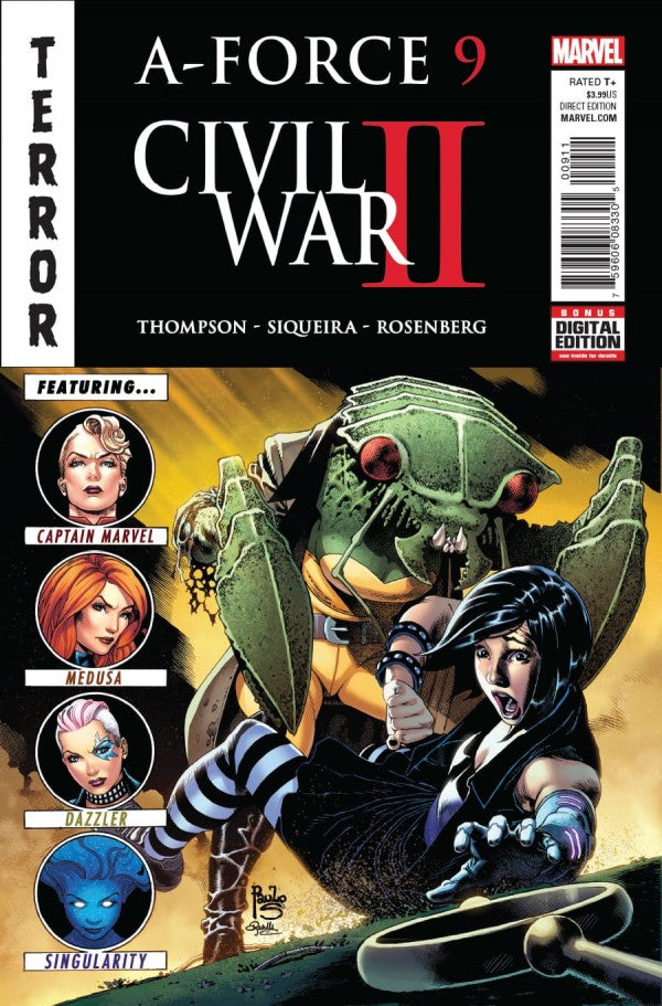 The fates of NICO MINORU, a mysterious missing girl named Alice, and a small town in Colorado are all tied together as CIVIL WAR II heats up and threatens to tear A-FORCE apart. The team, with ELSA BLOODSTONE in foul-mouthed tow, splits up to hunt down the apparent source of the trouble in the hopes of saving the town. However, it soon becomes apparent that all is not what it seems with the team -- A-Force is changing -- and by morning there may not be anyone left to save the day.