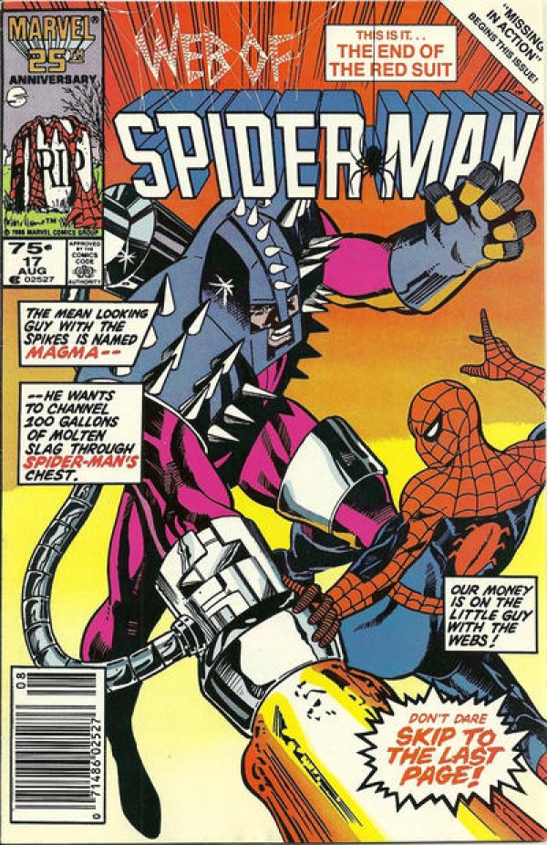 Magma starts by unleashing a jet of molten, erm, magma at Spidey, who, of course, avoids it. Joy and the others are trying to escape but the 'faceless' people corner her. Spidey realises he can't concentrate on Magma and the other three so swings off.Magma then takes Joy, Charla and Seth into some sort of central complex. We find out that Seth, although slow in some senses, is incredibly gifted mathematically. We find out that the reputable Roxxon company is responsible for the underground bunker. We get the Team-Up 110 flashback where Johnathan Darque - head of the energy company - became Magma to fight environmentalists who were protesting.He joined Roxxon in a top secret project in the Virginia mountains. He abducted Seth because he wants him to work on a project to use satellites...