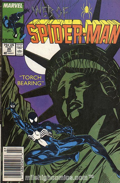 Pete and Mary-Jane are on a boat around Liberty Island. MJ makes some comment about the torch looking new and Pete tells her a story...Pete used to store his clothes there when he went out swinging as Spidey. One time, the renovation team had taken off the torch with his clothes, id and spare web shooter still in it. To keep his identity secret, he knows he has to get his stuff back ... except it's being taken to California for a parade!The Bugle pay for him to go there as part of a photo feature. Over in California though, some militant avocado growers (I swear I'm not making that up) are plotting to steal the torch to highlight their cause. Pete, meanwhile, has been told by the torch's guards to take a break as they are doing nothing at the time. He goes to the beach and gets beet-red...
