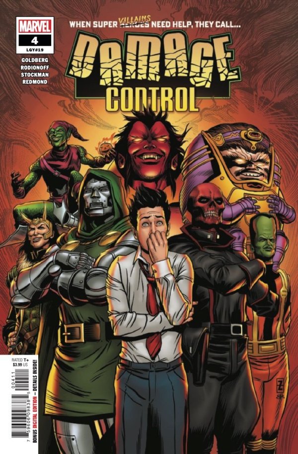 It’s been a tough first week for Gus at Damage Control. On Monday, he nearly caused a catastrophic Skrull attack. On Tuesday, he smushed a family who had been shrunk by Pym Particles, and on Wednesday, he turned himself into a monstrous guinea pig Kaiju. That’s why Gus has been banished down to research and development to assist Eugene Strausser. But introducing Gus to the one member of the Damage Control team who had a brief stint as a super villain could have dire consequences…Hans Rodionoff and Adam F. Goldberg write Gus into terrible situations and Nathan Stockman brings the bad guys to glorious life in our super villain-packed issue with appalling appearances by Doctor Doom, Green Goblin, Red Skull, Loki, the Wrecking Crew, M.O.D.O.K. and more.