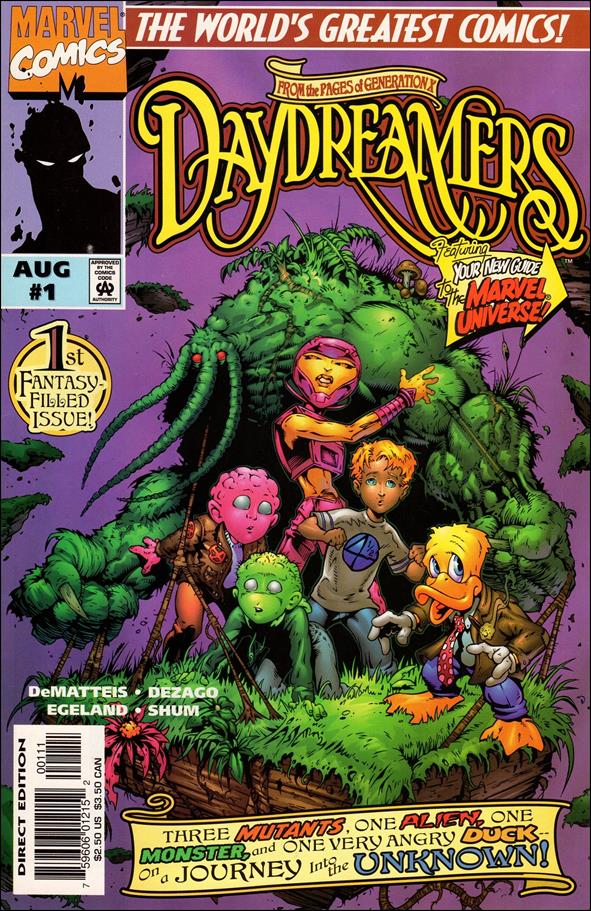 Having escaped from Black Tom [see Generation X #25], Franklin Richards, Leech, Artie Maddicks, Tana Nile, Howard the Duck and the Man-Thing now float on a chunk of earth through the Nexus of All Realities.  Tiring of Howard's complaining, Tana Nile tosses him off their 'island' and the Duck falls through one of the doorways populating the Nexus. Howard lands in Nevernevernarniozbia, a land that appears to be an amalgam of many storybook worlds peopled by fairy tale versions of super-heroes and villains.  The rest of the group follow through the same doorway, but are themselves followed by a living shadow called the Dark Hunter. The group is soon captured by a wicked version of the Scarlet Witch, then are reunited with Howard who has also been captured.  Leech negates the powers of his captors, and he and his friends almost escape, but are stopped short by the Dark Hunter.  To the shock of Howard and the rest, the Man-Thing speaks.