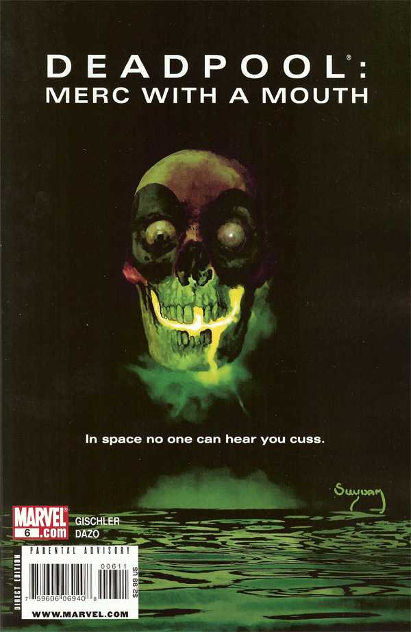 "HEAD TRIP," PART 6Space, the Final Frontier. O-ver-ra-ted. Wade, the severed Zombie Deadpool head and Dr. Betty find themselves back on good old Earth, knee-deep in swampy goodness. Seems like Headpool is a little homesick, and everyone agrees the zombie virus should be put safely back into its own dimension. All they've got to do is find that damn dimensional portal. Anyway, you don't think A.I.M, is gonna give up that easy, do you? No way. Just because their space station got itself all blown up doesn't mean they're out of the game. But wait -- who's this surprise guest star? Is it a MAN? Is it a THING? Well, you see where this is going ... Is this enough preview copy to get you to buy the damn book...because I can go on all night?!