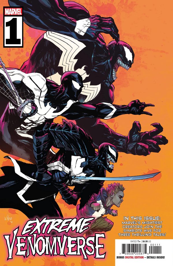 RETURN TO THE VENOMVERSE! Face front, Venomaniacs—to celebrate the 35th Anniversary of the creation of VENOM, the SUMMER OF SYMBIOTES IS UNDERWAY! And it all starts with EXTREME VENOMVERSE, a landmark series that’s going to take Mighty Marveldom to corners of the hive never seen before in three titanic tales! FIRST! Comics superstars Ryan North and Paulo Siqueira put a fresh and exciting spin on a story you may be familiar with…starring Eddie Brock as…SPIDER-MAN?! THEN! Your new favorite comics writer, Mirka Andolfo, shows you a side of the whole Brock family you NEVER thought you’d see! AND FINALLY! One of the best writer/artists in comics today, Leonardo Romero, reimagines Venom as a SAMURAI! But whether all of your new favorite symbiotes will survive this summertime saga remains to be seen…