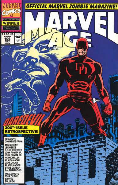 'Willie Lumpkin' strip by Stan Lee and Dan DeCarlo; Daredevil's most influential creators speak: Ann Nocenti, Lee Weeks, Al Williamson, Gene Colan, Steve Gerber, Stan Lee, John Romita, Jr., Klaus Janson, D.G. Chichester, Frank Miller, John Romita, Sr. and Ralph Macchio; 2-page Fred Hembeck strip; Reel Marvel - an interview with the Hulk himself, Lou Ferrigno (continued from #104); Take a Photo Tour of Marvel; Daredevil: The Lee/Colan Years; Marvel Age of Comics: 1985 (Part I); a look at still more Marvel Editors Trading Cards. Daredevil cover by Lee Weeks.