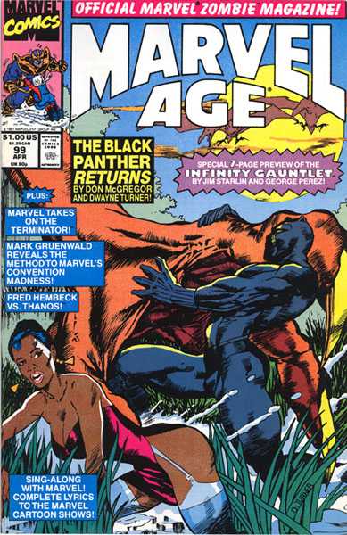 Lyrics to Marvel tv series theme songs; Don McGregor discusses Black Panther: Panther's Prey limited series; Dwayne McDuffie and Gregory Wright discuss Deathlok; 2-page Fred Hembeck strip; 7 pages from The Infinity Gauntlet #1 by Jim Starlin, George Perez and Joe Rubinstein; Black Panther. Cover by Dwayne Turner.