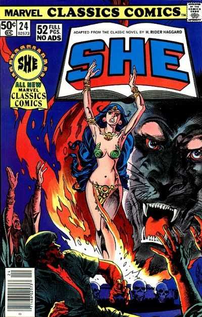 Cover pencils by Gil Kane, inks by Rudy Nebres. Short H. Rider Haggard biography. "She," script by John Warner (adaptation), pencils by Dino Castrillo, inks by Rod Santiago; Horace and Leo travel deep into Africa to find the legendary She, an immortal queen. H. Rider Haggard pinup by John Romita, Jr. Adapted from the H. Rider Haggard novel "She: A History of Adventure" (1887).
