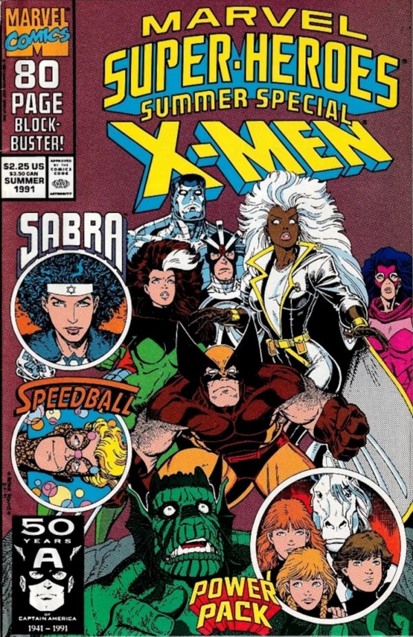 "Third Time's the Charm!" Part 1 of 3. Guest-starring the X-Men and Doc Samson. Script by Roy Thomas and Dann Thomas. Pencils by Rich Buckler. Inks by Jim Sanders. Cover by Art Adams. The Mark II Sentinels are back! And the mutant-hunting robots are still trying to sterilize humanity via solar flares! However the Uncanny X-Men, currently hiding in Australia and presumed dead, are in perfect position to stop their long-time foes! But the Sentinels add a twist to their usual scheme by abducting gamma-radiated humans! What exactly is going on in the land down under? Cameo appearances by Cynthia Chalmers and the Abomination. Flashback cameos by the original X-Men and Larry Trask to recap the events of X-Men (1st series) 57-59; and by the Avengers to recap the events of Avengers 102-104. X-Men Lineup: Colossus, Havok, Psylocke, Rogue, Storm, and Wolverine. Second story: "Natives in a Strange Land!" Guest-starring Power Pack and Franklin Richards. Script by Michael Higgins. Pencils by Steve Buccellato. Inks by Don Hudson. Power Pack's family vacation to the Caribbean is interrupted by the sudden appearance of the Monster from the Lost Lagoon! Wow, where has he been since Fantastic Four 125 many years ago? The creature has returned with a mate and offspring aplenty! Can Power Pack help the creature and his family get back home? Third story: "Mercy Street" Guest-starring Cloak and Dagger. Plot by Jack Herman. Script by Barry Dutter. Pencils by Jim Redington. Inks by Tom Dzon. Dagger avenges the death of a childhood friend. Fourth story: "Fruits of the Wound" Guest-starring Sabra. Script by Scott Lobdell. Pencils by Paul Abrams. Inks by Steve Buccellato. Sabra battles Windstorm to save a young boy's life. Fifth story: "The Bouncer" Guest-starring Speedball. Plot by Steve Ditko. Script by Mary Jo Duffy. Pencils by Steve Ditko. Inks by Dan Atkins. Speedball battles the Big Bouncer! Sixth feature: Pin-up of Nick Fury and Contessa Valentina Allegra de la Fontaine by Jackson Guice; pin-up of Thor and Loki; pin-up of the Thing by Al Milgrom. (Notes: The first and second stories are 22 pages each. This issue includes a full-page ad for the Ground Zero trade paperback featuring the Hulk by Peter David and Todd McFarlane)