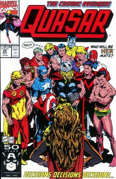 Her's quest for the ideal mate brings her into contact with Jack of Hearts, Colossus, Cyclops, Wolverine, Wonder Man, Hercules, Captain America, Hyperion and (of course) Quasar in "Mating Dance". Part 1 of 2, continued next issue. Script by Mark Gruenwald, pencils by Greg Capullo, inks by Harry Candelario. Moondragon, Thor cameos. Capullo/Keith Williams cover.