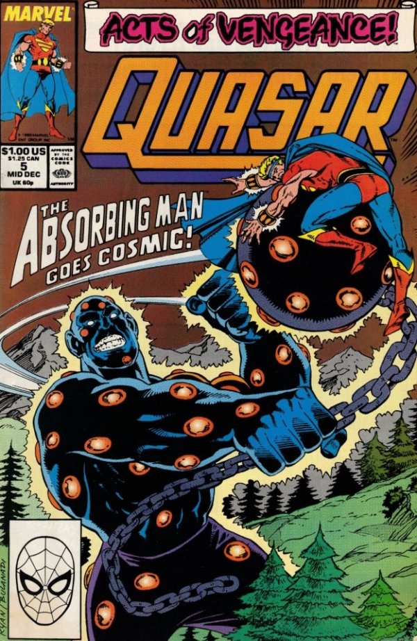 Acts of Vengeance! tie-in. The Absorbing Man poses an even bigger threat than usual when he absorbs the quantum-bands' power in "The Absorption Principle". Script by Mark Gruenwald, pencils by Paul Ryan, inks by Danny Bulanadi. Captain America, Stingray cameos. Ryan/Bulanadi cover.