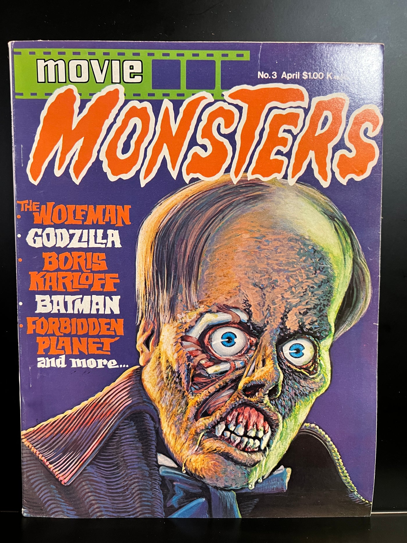 Articles on horror films illustrated with movie stills, similar to Famous Monsters of Filmland. The Phantom of the Opera; Godzilla; the films of Boris Karloff; Hammer Films Wolf Man vs. the Universal Pictures version; Forbidden Planet; the original Batman movie and TV series. Part of the short-lived Atlas line from former Marvel publisher Martin Goodman. Awesomely creepy cover by George Torjussen.